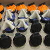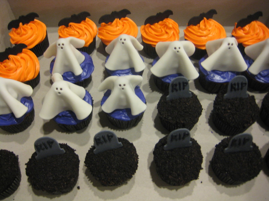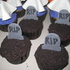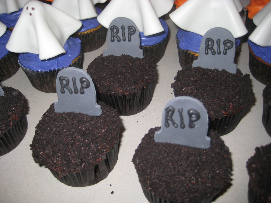 Cupcakes iced in BC. Tombstone tops have oreo crumb "dirt". Tombstones, bats and ghosts are MMF.
