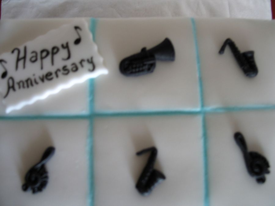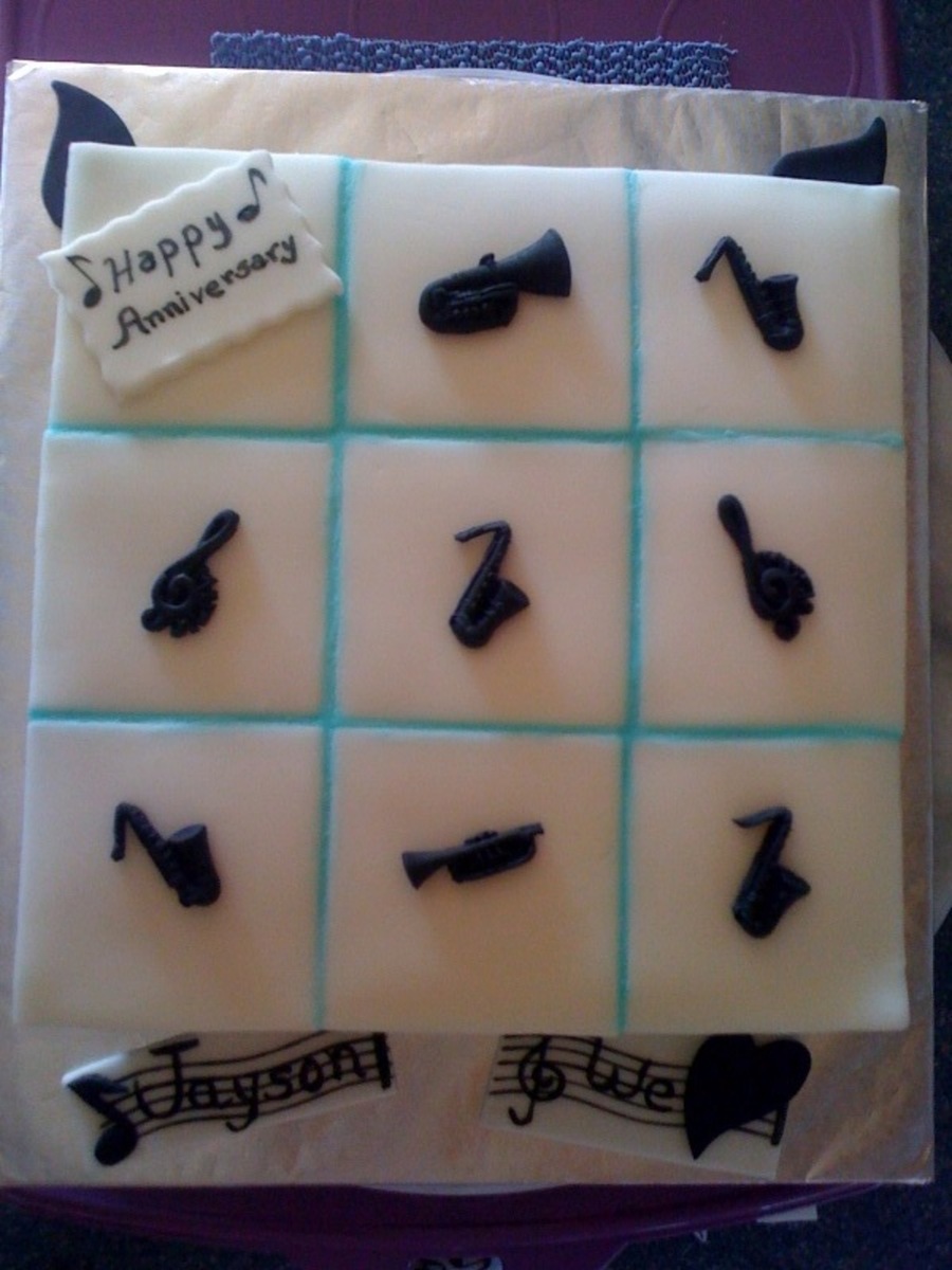 Made this cake for a wedding anniversary. She wanted a cake that combined the husband loves for Jazz music and his business (Tiles) so this was my idea. I cut all the tiles and groud it with RI, all the decorations are fondant. Instruments made with a mold.