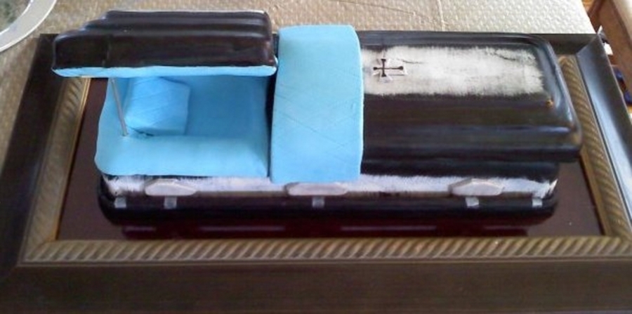 Here is my coffin cake. I made this fr my 12 year old niece for her very first Halloween party. She wanted something a bit spooky and something that doesn't look so much like a cake and that would impress her friends. The cake was a big hit.