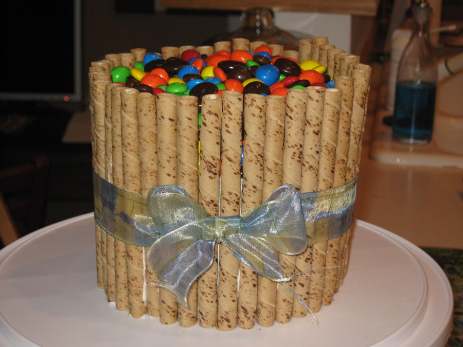 Yellow cake with BC. Spiral wafer cookies and topped with M&M's and Junior Mints - my sisters favorite candy! Thanks to CC for all the inspiration.