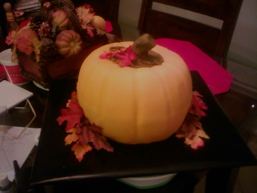 Was ,my 1st pumpkin. Loved how easy it was to make it was ordered for a fall theme baby shower I filled the center with candy corn. The cake was white with chocolate filling. The customer loved it!