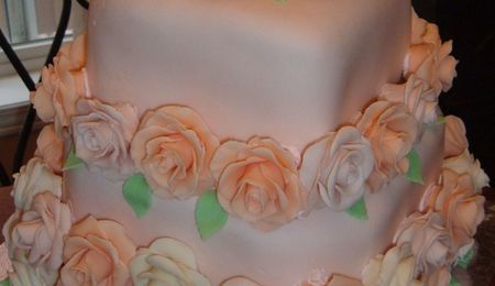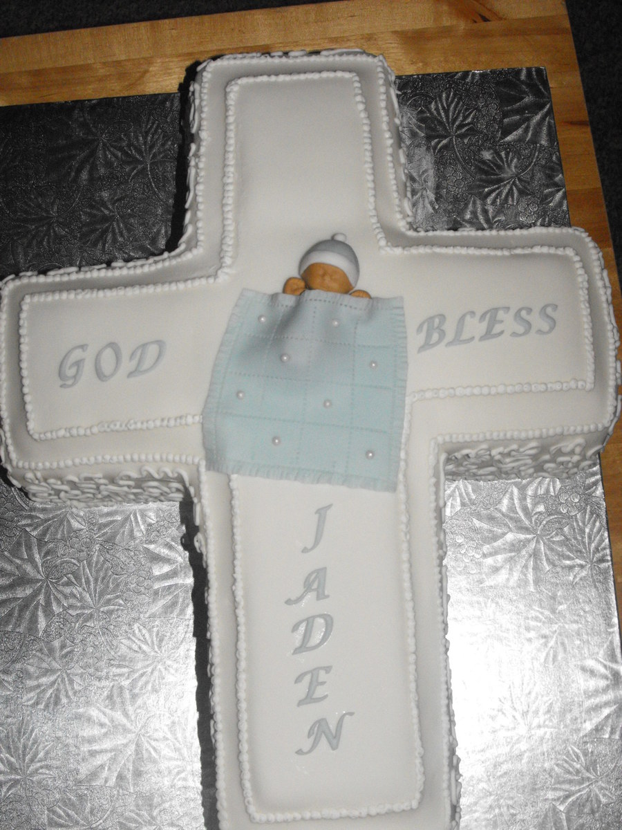 Vanilla Cake carved and filled with vanilla buttercream. Covered in fondant, gumpaste baby and blanket. Royal icing beading and cornelli lace.