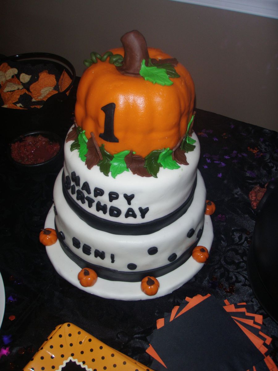 I made this cake for my son's first birthday party. The cake was covered in MMF. The bottom and middle tiers were french vanilla with pumpkin spice buttercream filling. The pumpkin was banana flavored cake (my son LOVES banana) with the same filling. I gave my son the top as his smash cake. He loved it! This was also my first true homemade cake, as was my first try at MMF and making a tiered cake. It was a huge hit!