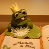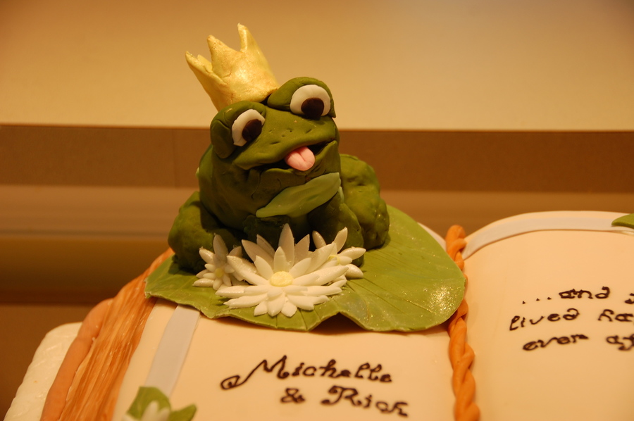 Bride was very into the traditional Frog Prince. Entire Cake is butter Yellow pound cake Frog is rice krispies covered by fondant Everything is edible and made of fondant. First time doing 3-d modeling!