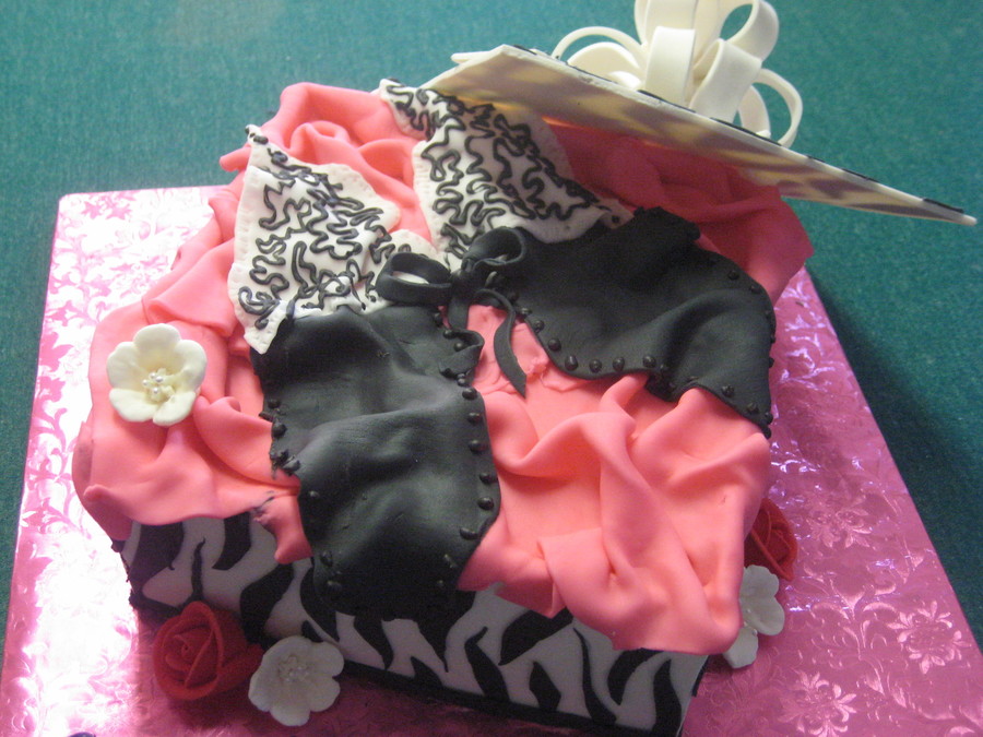 This is a zebra print lingerie cake for bridal shower/bachelorette shower. Brownie extreme cake covered in fondant with all fondant detail. Gumpaste lid and flowers