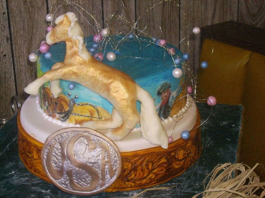 This is the cake I made for the "Sweet Times in the Rockies" cake show in Denver this weekend. The cakes are fake of course but they are covered in fondant with the horse made of modeling chocolate and the belt buckle is gumpaste. The second tier is painted and the bottom is a fondant band made to look like tooled leather, I also covered the board with fondant in a distressed finish and painted to look like denim. I wanted the top to look like fireworks with wires and fondant pearls.