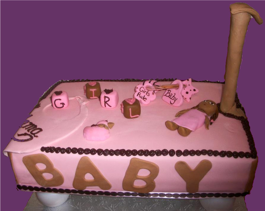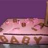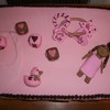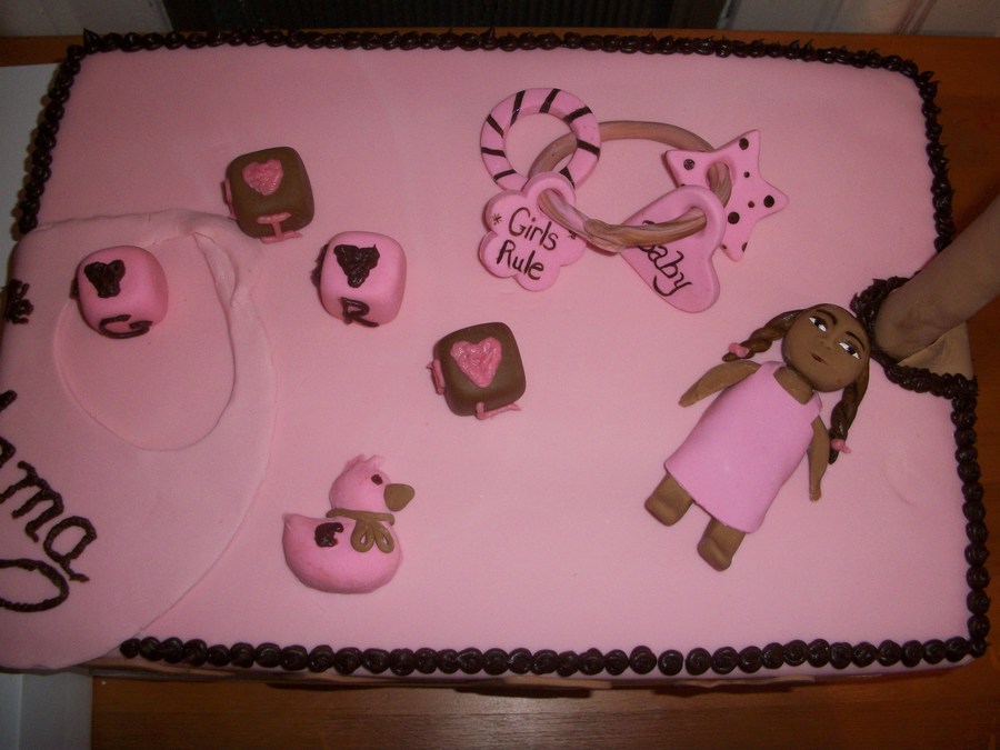 This was pretty simple. A sheet cake with round pillars as the wheels. The toys were pretty much what made the cake(no pun intended..lol) I love the toys I did this time! I made a teether ring with different shapes. A flower with "girls rule" a heart "baby" and other shapes. Blocks and a doll baby. All made with gumpaste. On the back of the wagon was a baby bib