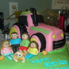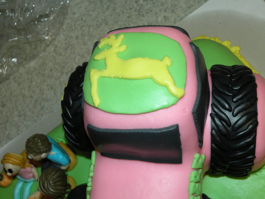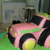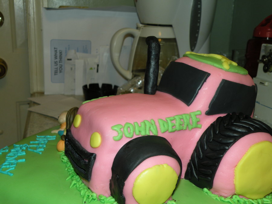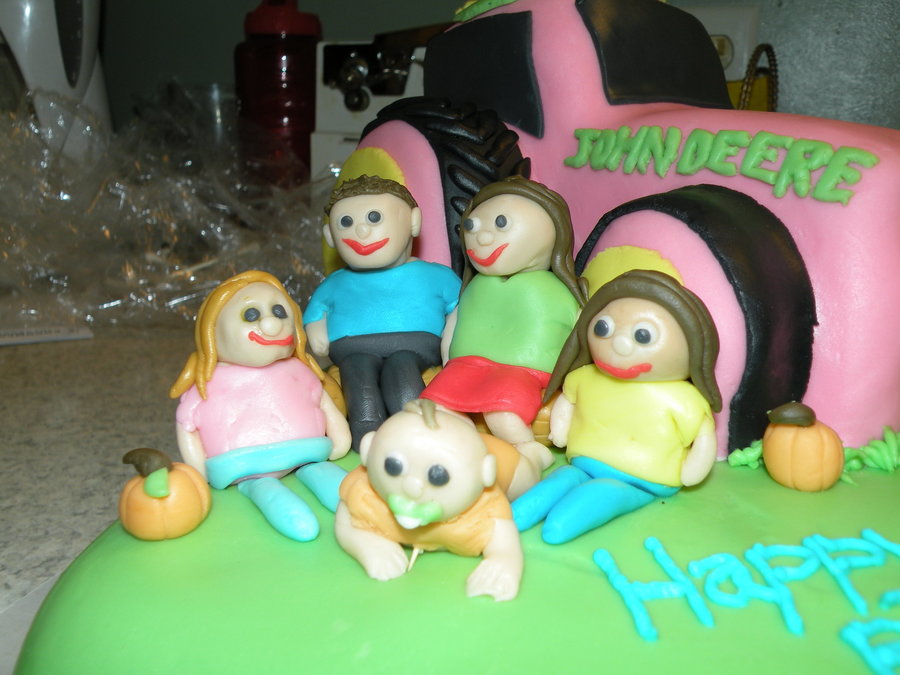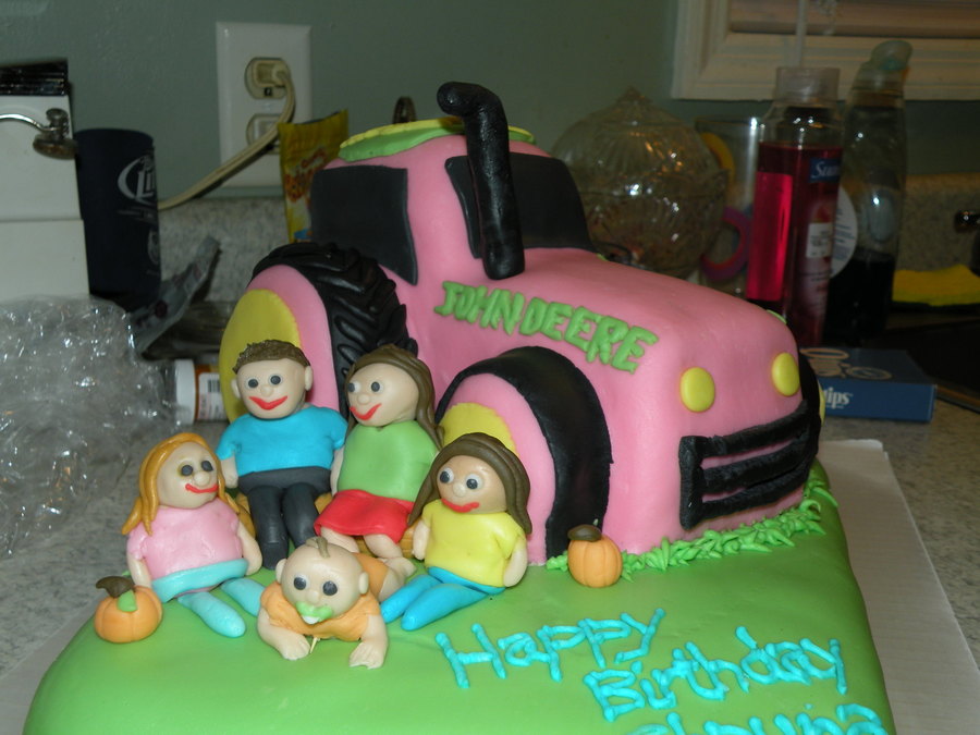 This is a pink john deere tractor cake that I made for a girl's 25th birthday! It was very fun to make! I made my own marshmallow fondant, and the people are made out of fondant. I made people to represent her, her husband and 3 kids! This was my 2nd attempted "3D cake"