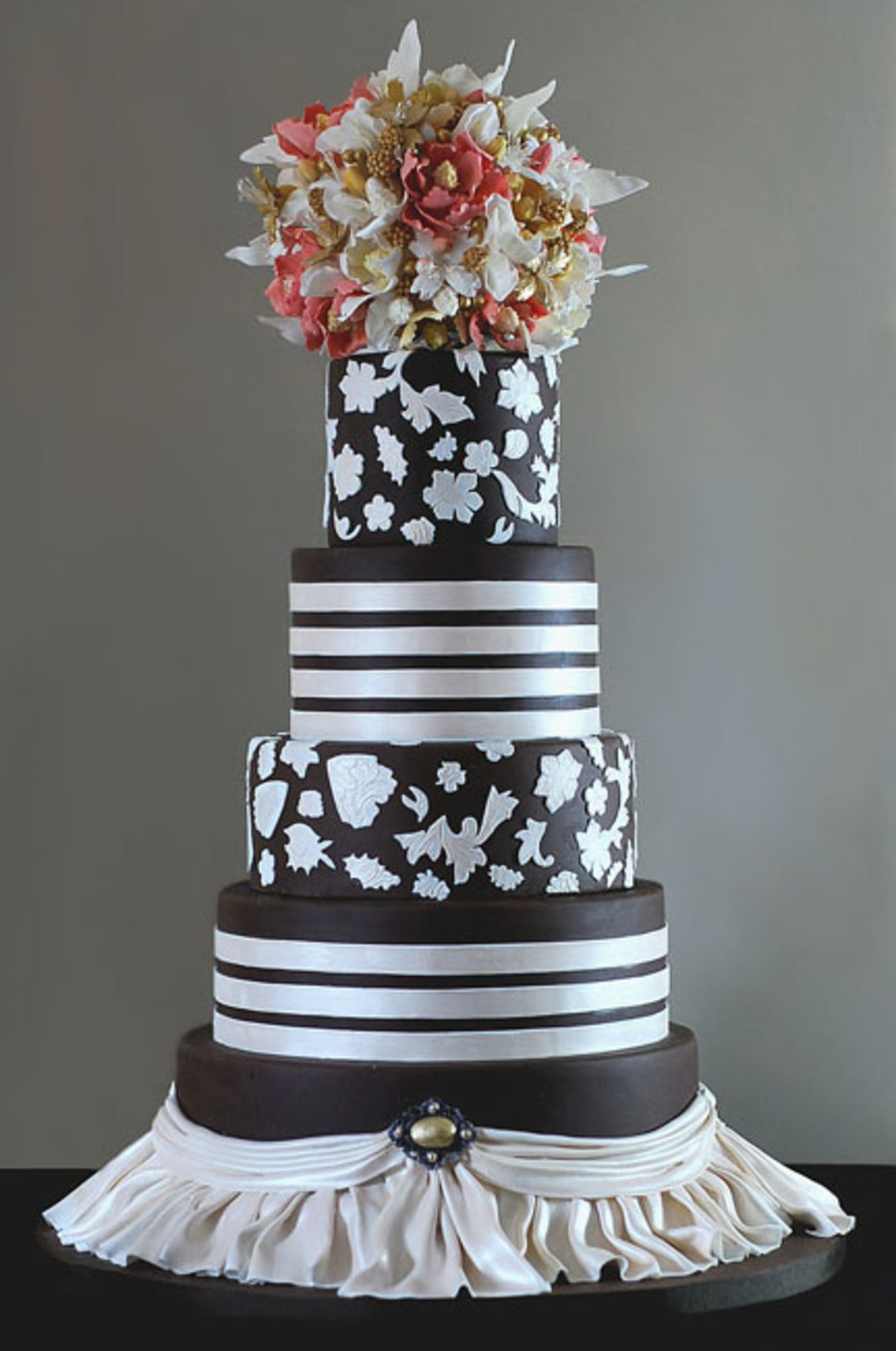 My 10th fondant cake for mom's birthday. I used 14, 12, 10, 8, 6 round pans. All the flowers are handmade, except for the 4 petal ones. I used Jennifer Dontz's fondant, Fondx and Dark Choc. Satin Ice. The pendant is made of gumpaste using a mold.