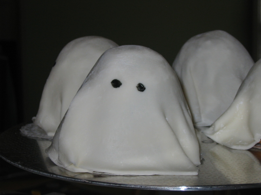Yellow cake baked in the mini wonder pan, hollowed out and filled with vanilla bean buttercream, covered in same buttercream with an mmf fondant 'sheet'. Americolor candy writers used to draw the eyes. Thanks to all who've posted similar for the idea. I was in such a rush to get this to the school that I took the photo before I'd brushed all the icing sugar off!
