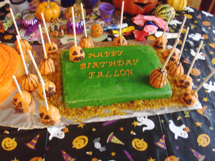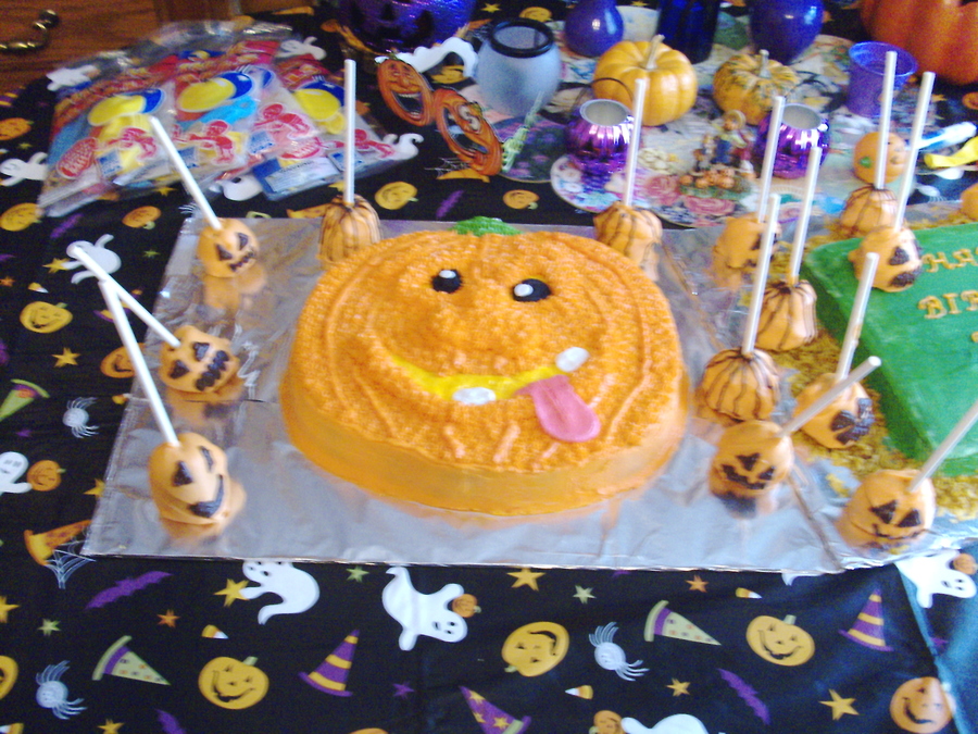 this is a vanilla cake with BC icing. I copied the picture from the 2007 Wilton Yearbook. My cousin picked the pumpkin face out for her birthday. The pumpkin patch was an added extra with pumpkin brownie pops.