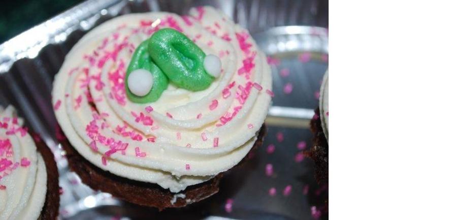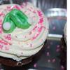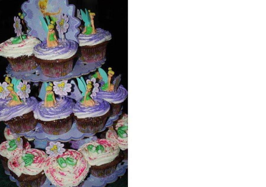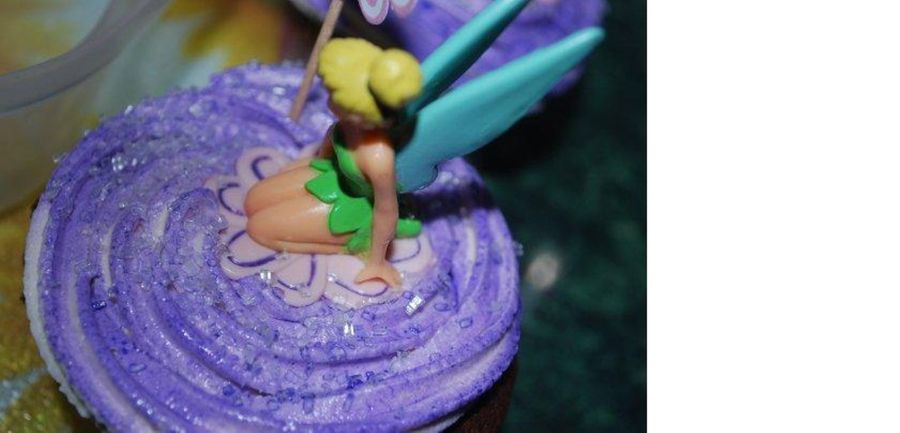 I made these for my daughter's 3rd birthday. She is allergic to milk, so they are completely dairy free. They are my first attempt at decorating. I made white buttercream and spray painted it with the icing spray and used sugar sprinkles. I bought the Tinkerbell plastic and paper picks at Michaels. The green tinkerbell shoes I made out of white fondant, which I shaped in to little ovals and then used the tip of a paintbrush handle to make the indention. I then painted the shoe with green sparkle dust mixed with a little lemon extract. Then I topped the shoe with a tiny white fondant ball for the finishing touch.