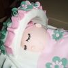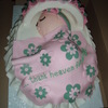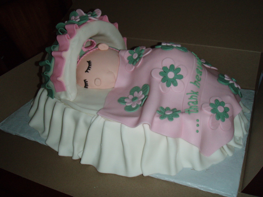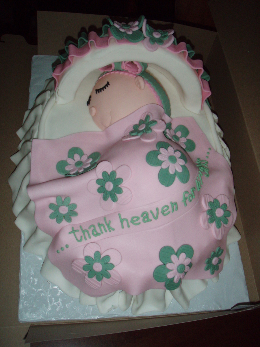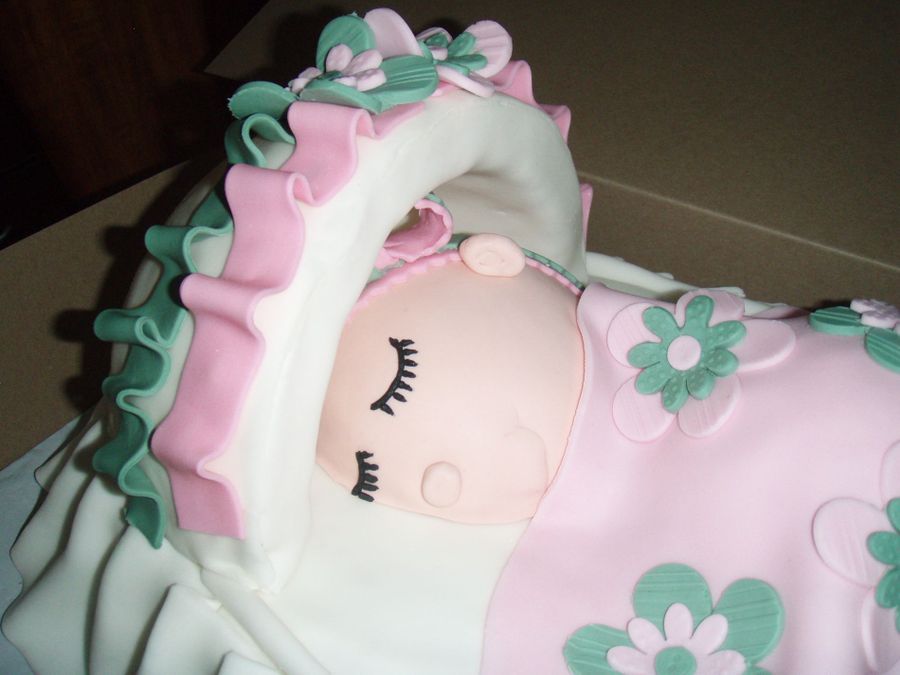 This is an oval cake with foam canopy covered in fondant. The baby is all cake covered in fondant.