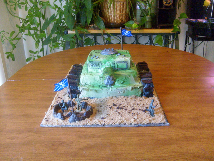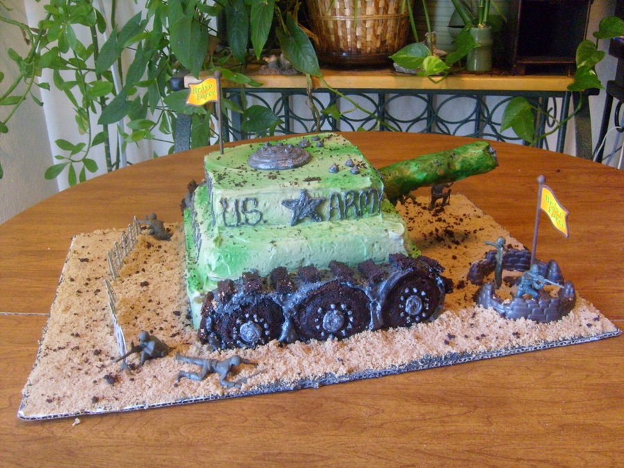 tank cake i made for kids birthday, wheels made out of cupcakes, coverd cake board in brown sugar and sprinkled cake crumbs every where to make it look dirty