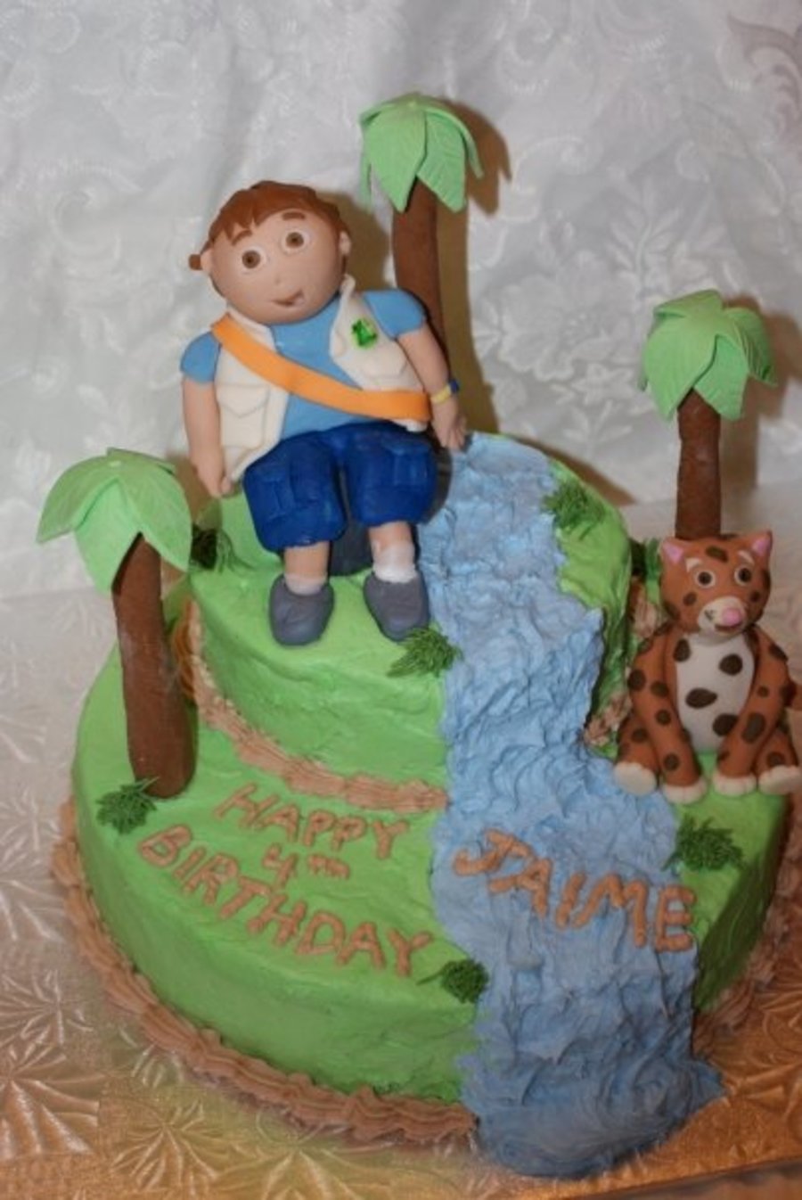 This is a single layer 10 inch white cake topped with a single layer 6 inch white cake. All the icing is vanilla butter cream. Diego, Baby Jaguar and the palm trees are hand made out of gum paste and fondant. (October, 2009)