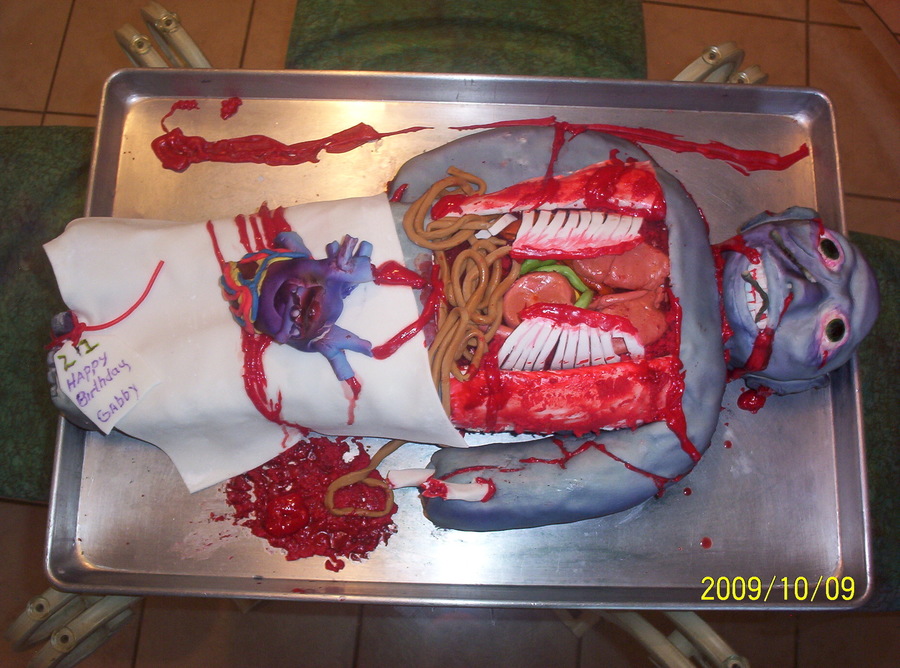 ALIEN AUTOPSY CAKE, RED VELVET CAKE,FONDANT INTERNAL ORGANS, ROYAL ICING RIBS,TEETH AND BONES,BLOOD IS WHITE CHOCOLATE TINTED RED. ONE OF MY MOST FUN CAKES