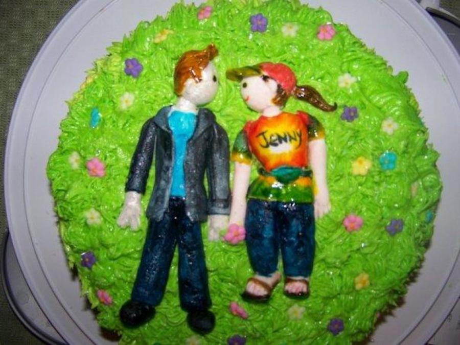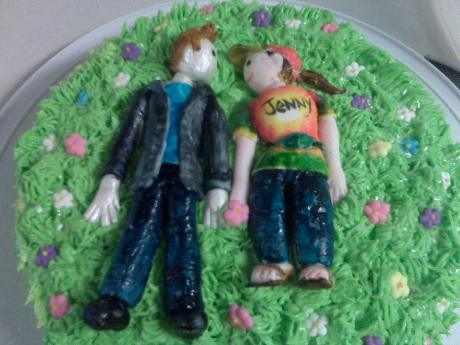 My friend Jenny is a short little hippie girl who wears tie-dye shirts, baseball caps, fanny packs and birkenstocks. This is a gumpaste Edward and Jenny. lol