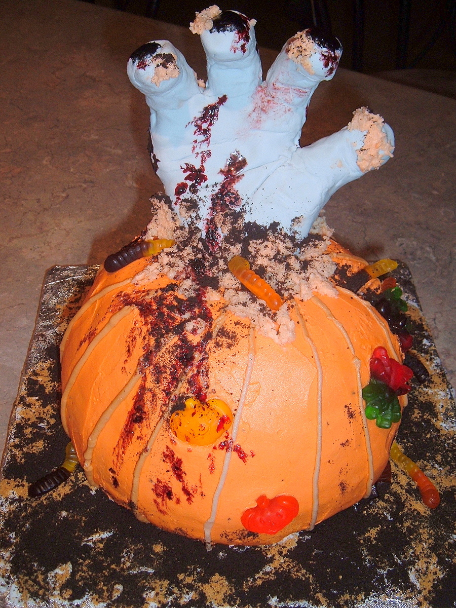 My first attempt at a rice crispy treat figure, that is what I made the hand out of and covered it in fondant. The cake was carved from 2 - 10" rounds and 2 - 8" rounds, filled with chocolate mousse and buttercream. The pumpkin was iced in buttercream with accents of gummy worms, spiders, chocolate cookie crumbs (for dirt). Enjoy!