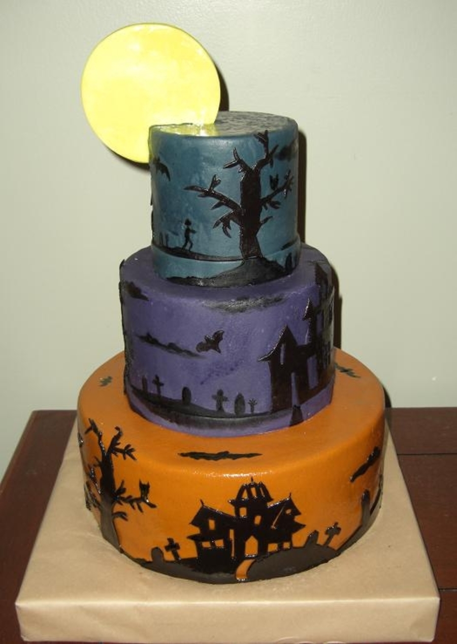 This cake is covered in fondant. Some of the trees and houses are hand cut out of fondant and most of the other decorations (graves, hands, people) are hand painted with black food coloring. The moon is fondant that I let dry and then wedged into the side of the top tier. Thank you for other members of CC that helped me get the ideas for this cake.