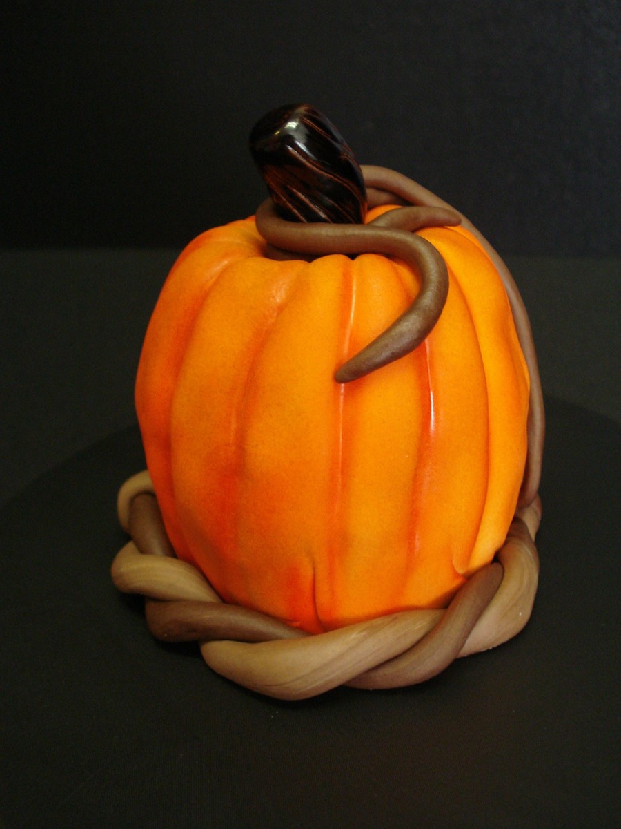 I really wanted to try a pumpkin and since I had leftover batter from my hat cake, I decided to try a mini pumpkin! I used two mini bundt pans. It's covered in fondant with fondant vines and stem. I also airbrushed the pumpkin and stem.
