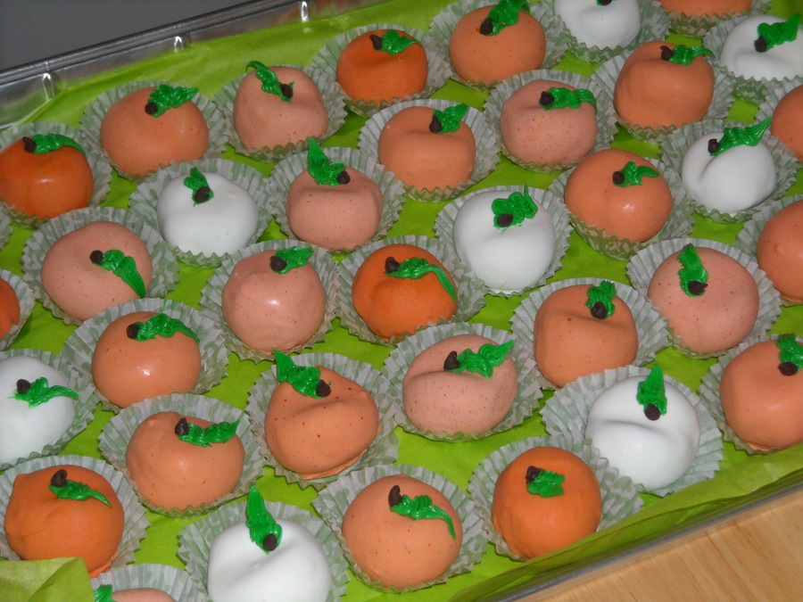 Pumpkin Spice cake balls. I was quickly running out of orange candy color, so the cake balls progressively got lighter. The stems are mini chocolate chips.