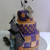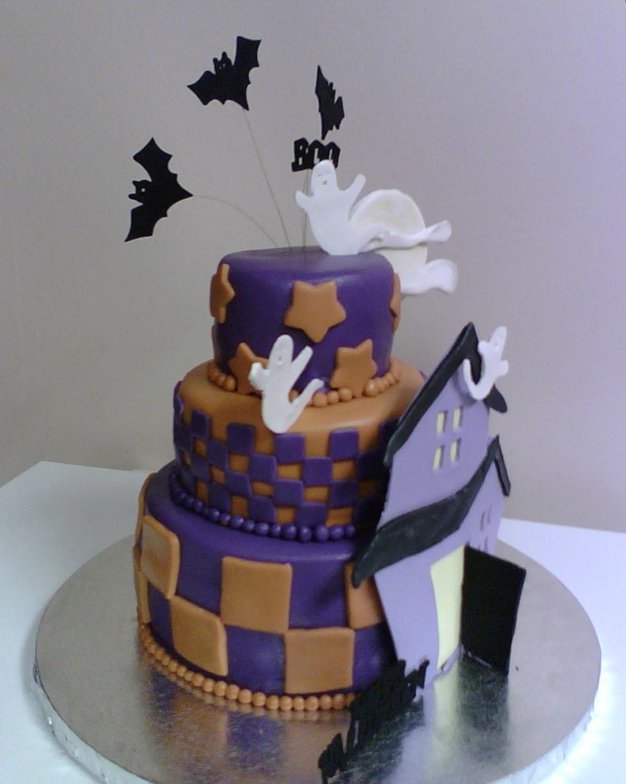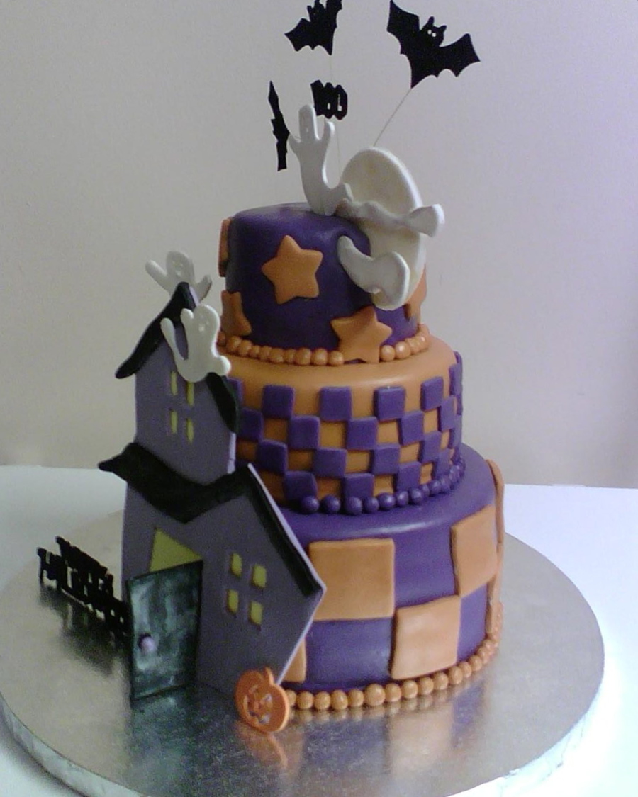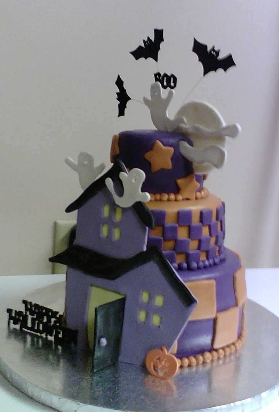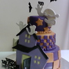 Covered in fondant. House, ghosts, moon and clouds are gumpaste. I cheated and used foam bats, pumpkin, and letters!!! But the house was the main decoration, and I am prayingggg that it does not collapse!!!