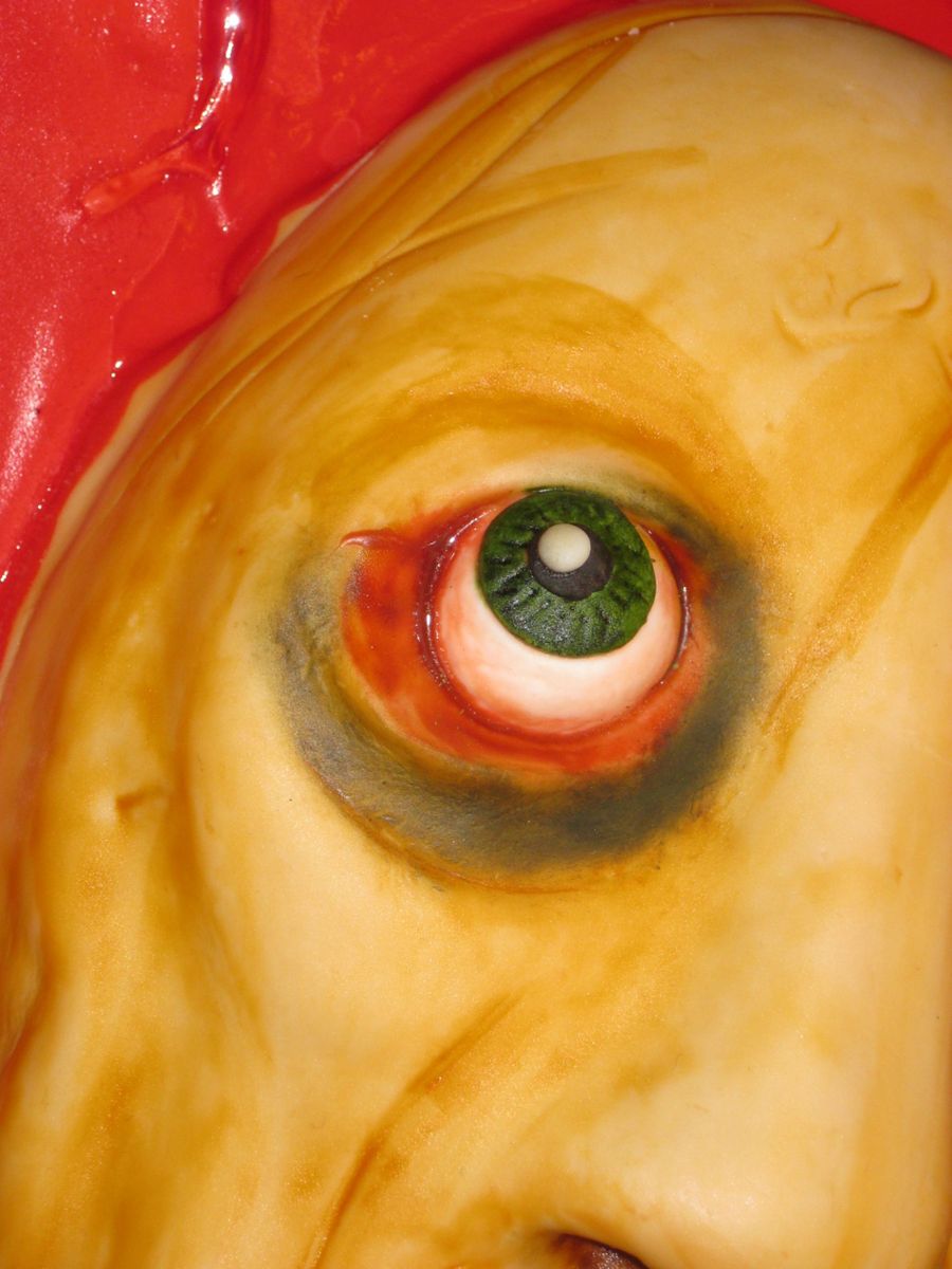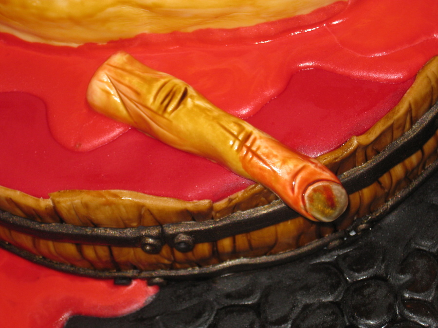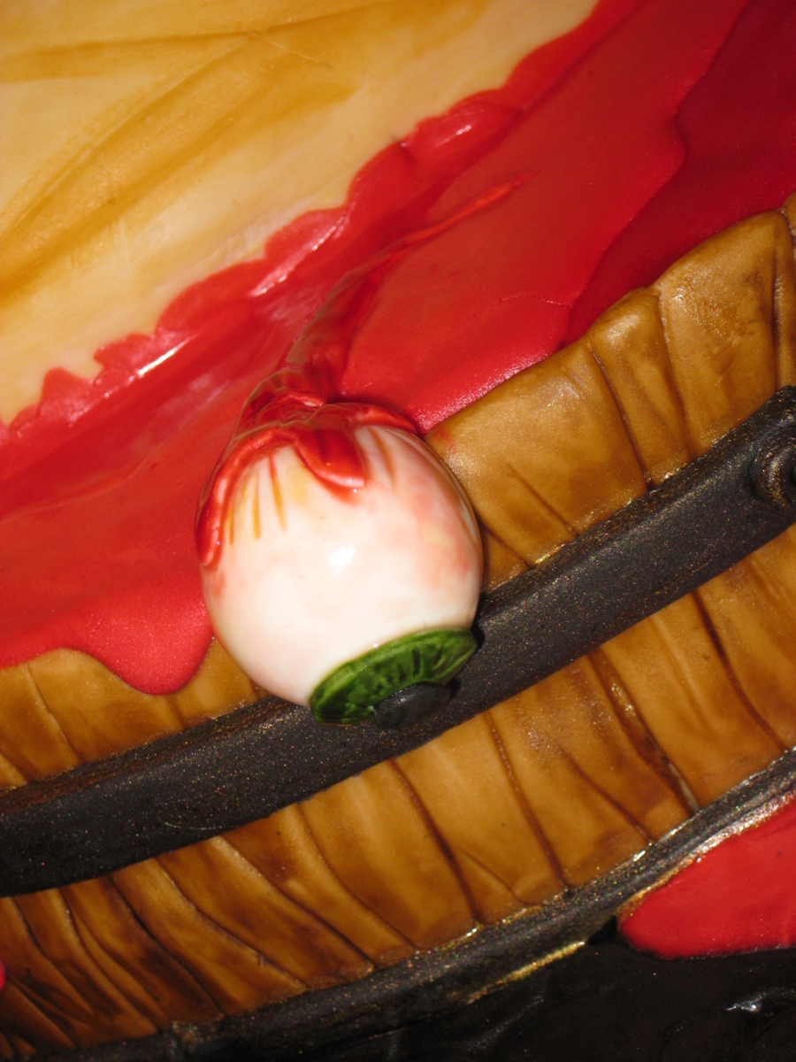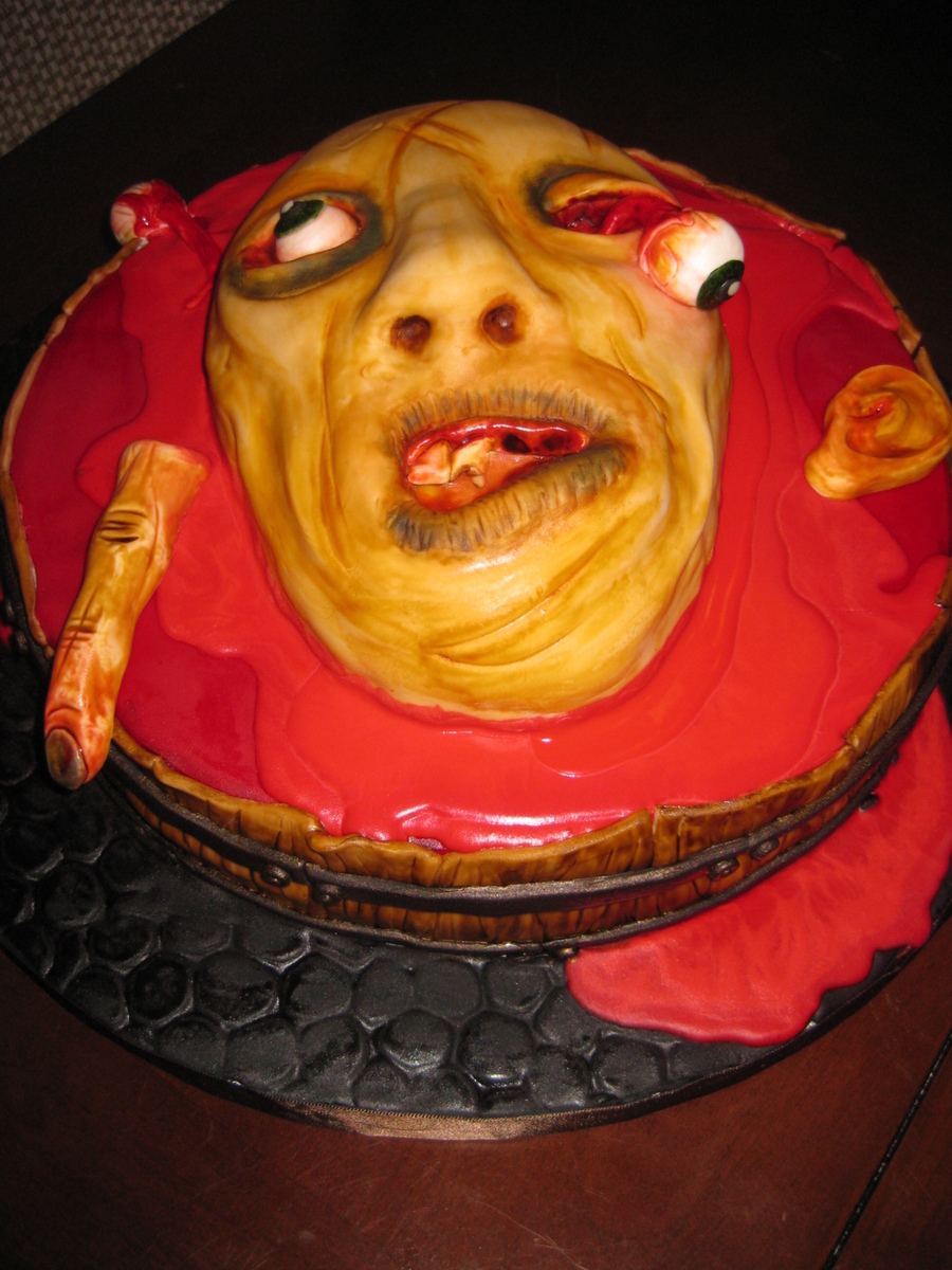 His severed head floats in a pool of blood in a creepy wooden barrel.. EVERYTHING DELICIOUSLY EDIBLE!!