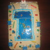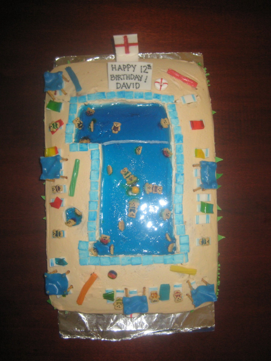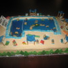 This was my son's birthday at our clubhouse, so I made a replica of the pool deck. It's covered in BC. The grass, tiles, lounge chairs, life gaurd chair, beach balls are fondant. The tents are airheads, the towels are fruit roll ups, the noodles are twizlers and the people are mini teddy grahams. I placed the teddies in the jello too soon, cuz they melted and the airheads were too thin for the pretzel sticks. The cake tasted really good soaked in the blue jello.