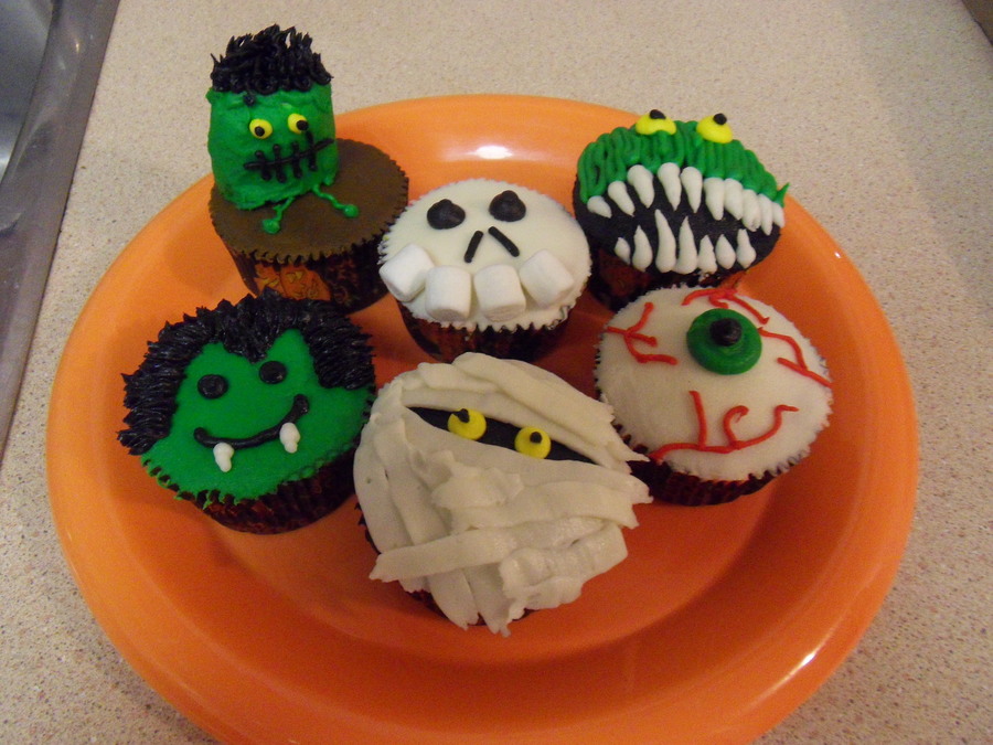 Got the idea for these from lots of different cc users and some wilton inspired. Made for my nephews grade 4 class :) All butter cream icing, except for the marshmallow green alien and the teeth of the skeleton :) tfl