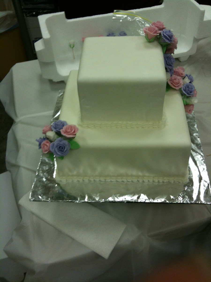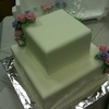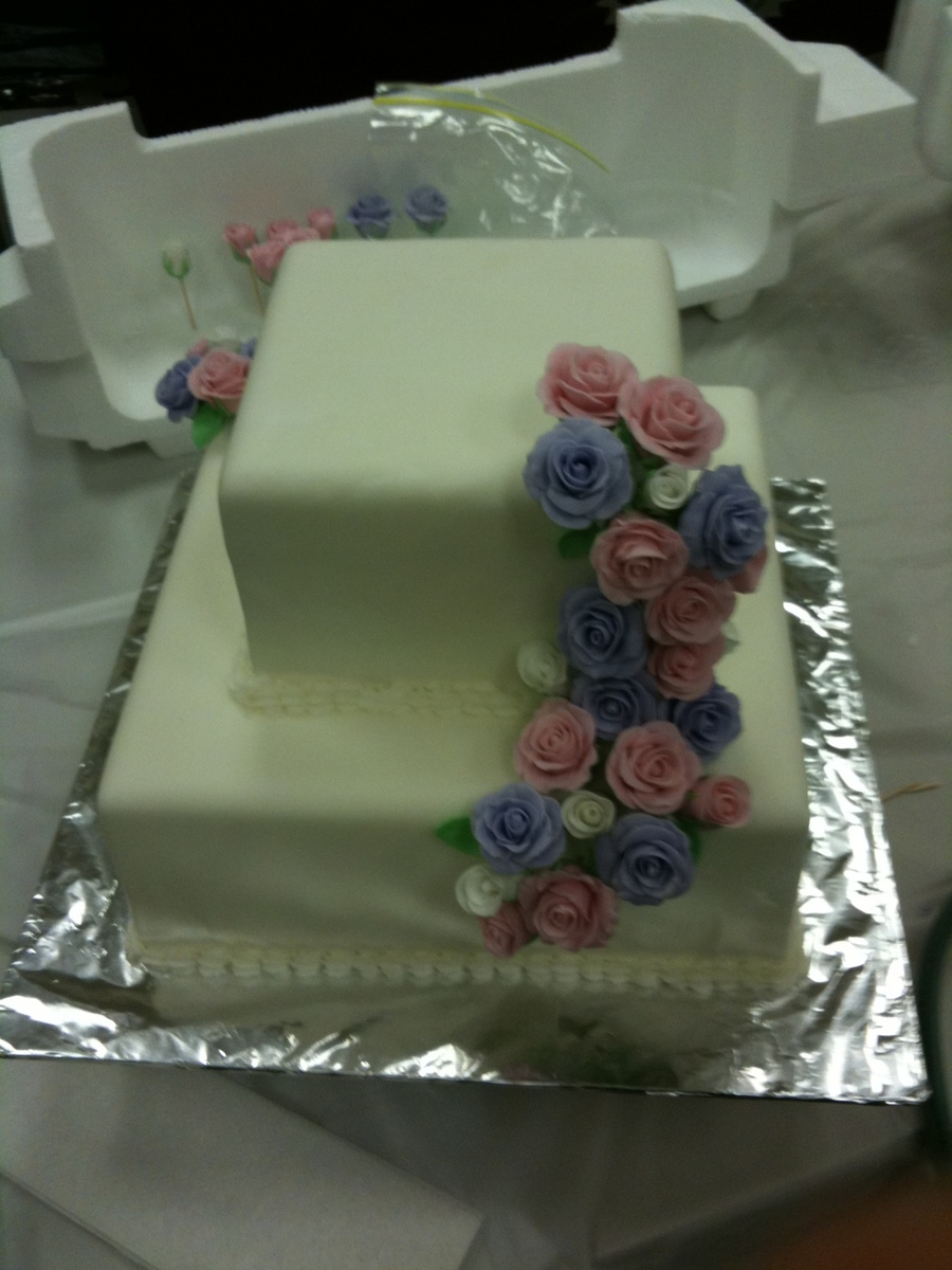 Course 3 final cake. Covered in fondant with fondant roses. Buttercream shell border.