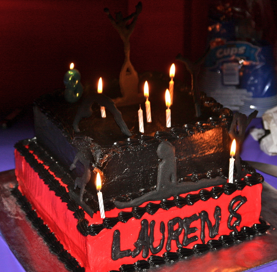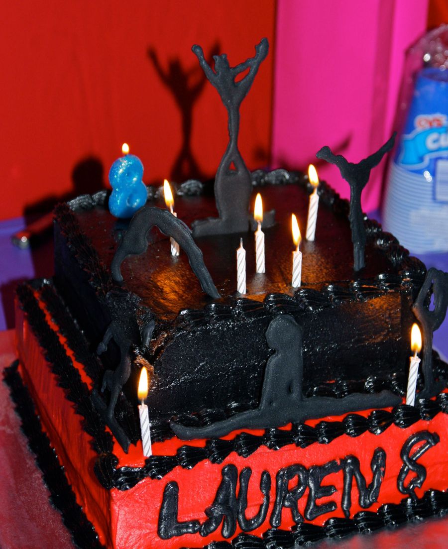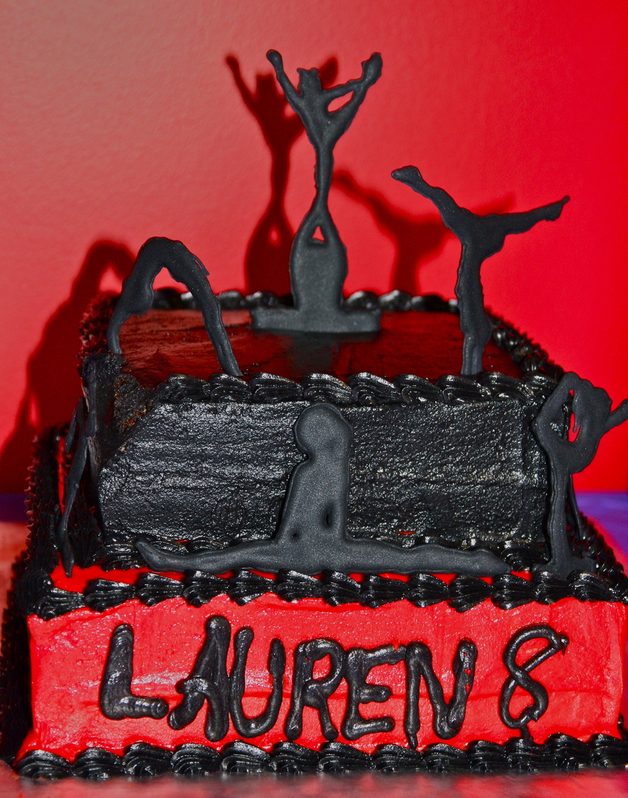 This is a cheer cake I did for my daughter's Birthday party that was at her cheer team's gym. This is the first cake I've actually made in like 2 years. So it's not so great. She helped write her name; she loves to help :) . Cake is white with buttercream icing on bottom and chocolate with chocolate icing on top. Even so there was still enough black to give it that yucky flavor; yuck! Cheer poses are in colorflow. On the right corner on the top; it's messed up bc one of the girls that helps host the party accidentally hit a jug of punch up against it