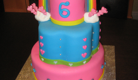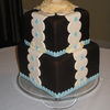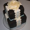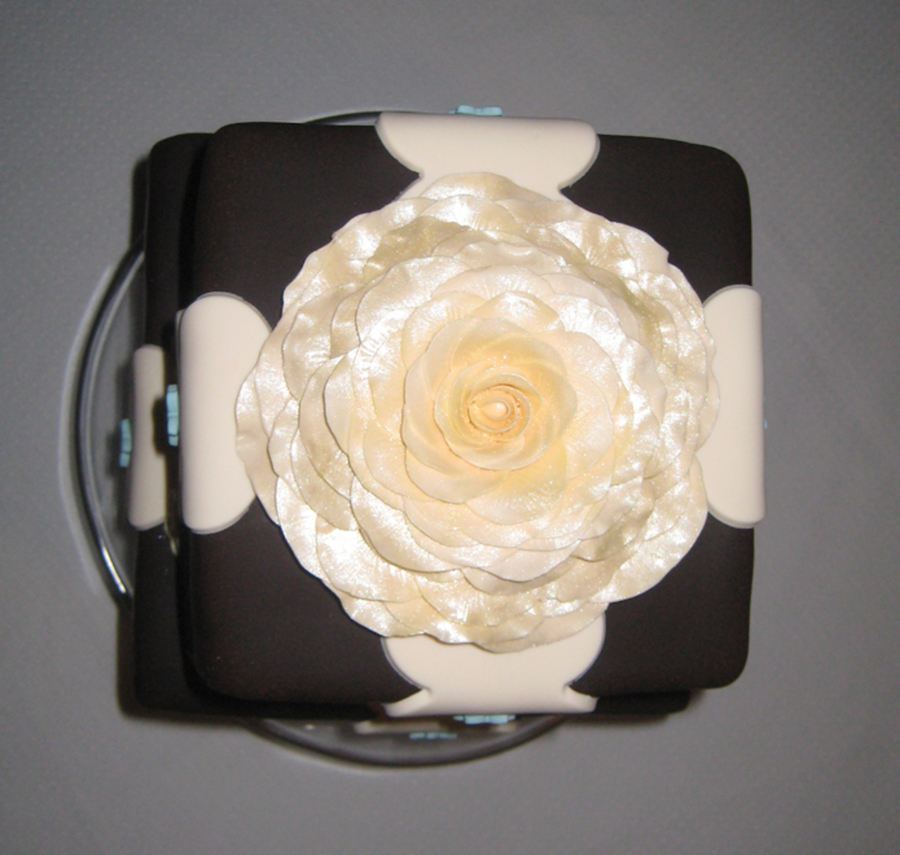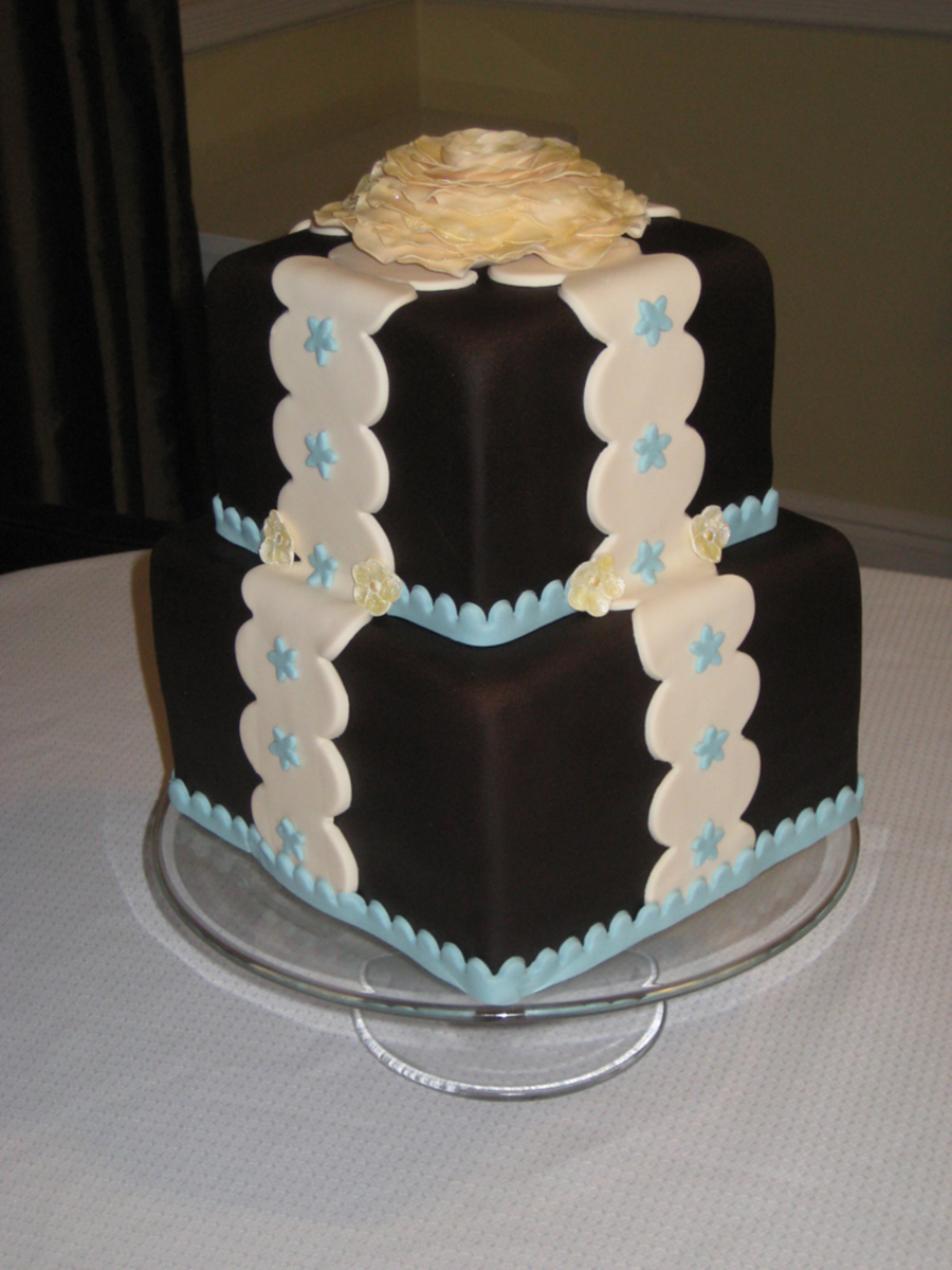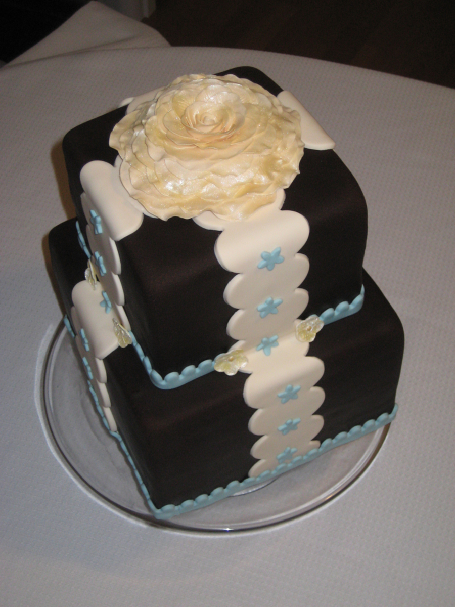 This was made for fun and practice. Inside each tier are four layers of chocolate and vanilla/orange cake, vanilla buttercream. Covered in dark chocolate fondant. The rose on top is made from gum paste.