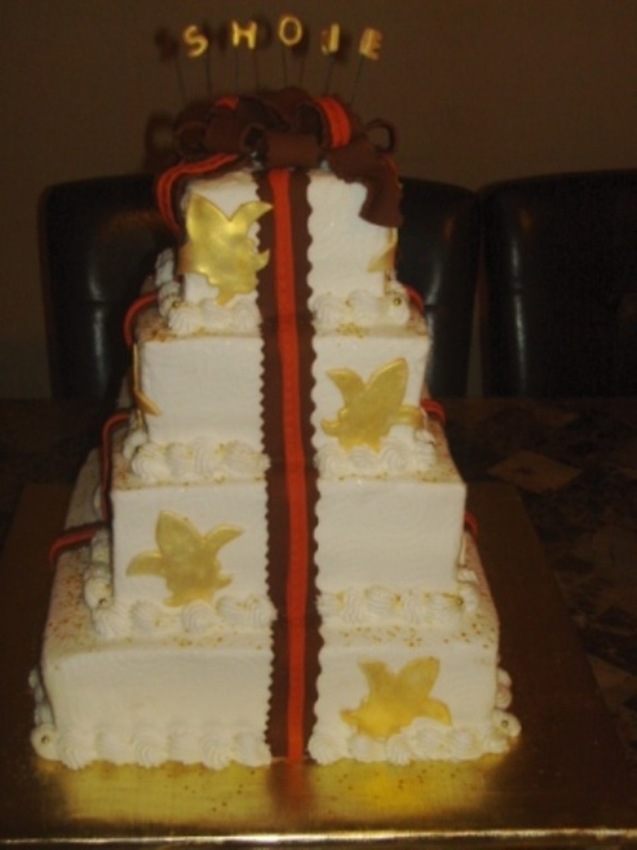4, 7, 9 and 12in white cake, Satin Ice decorations.
