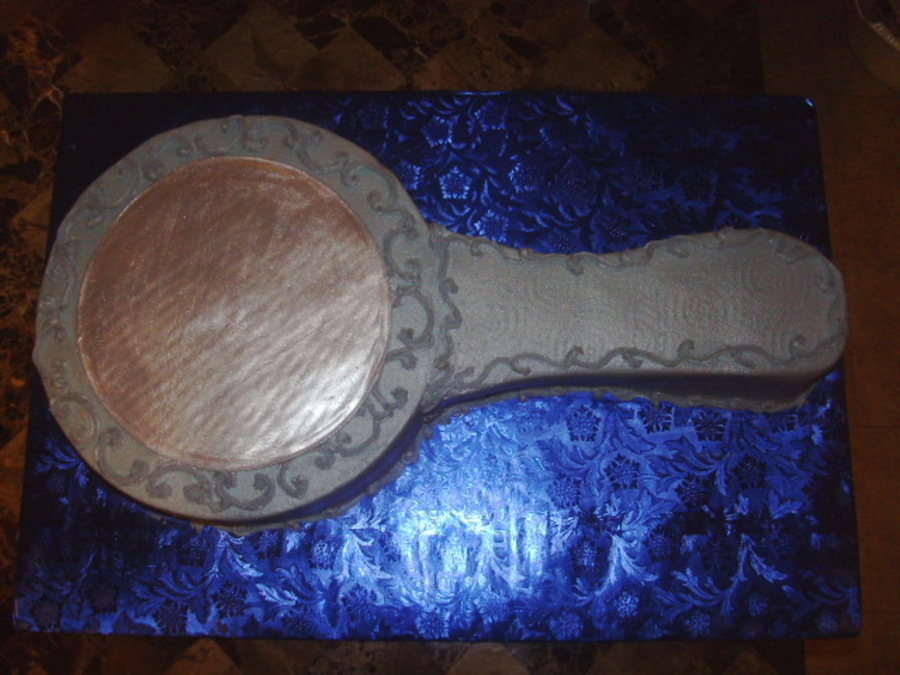 Mirror Mirror forum at Dillard University in New Orleans, used a10in round for mirrior and a side of a 9x13 carved to the shape of the handl. Their colors are royal and silver. BC icing, fondant mirror...TFL