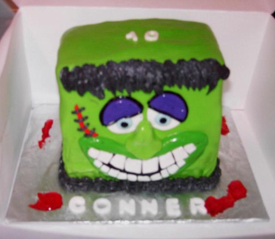 This is a 3D Frankestein that was made for a little boy. His bday is on halloween so he wanted a seasonal cake. He choose this design from the internet. It was fun to make. Vanilla cake with vanilla buttercream and covered and deocrated in fondant. Hair and cut are buttercream.