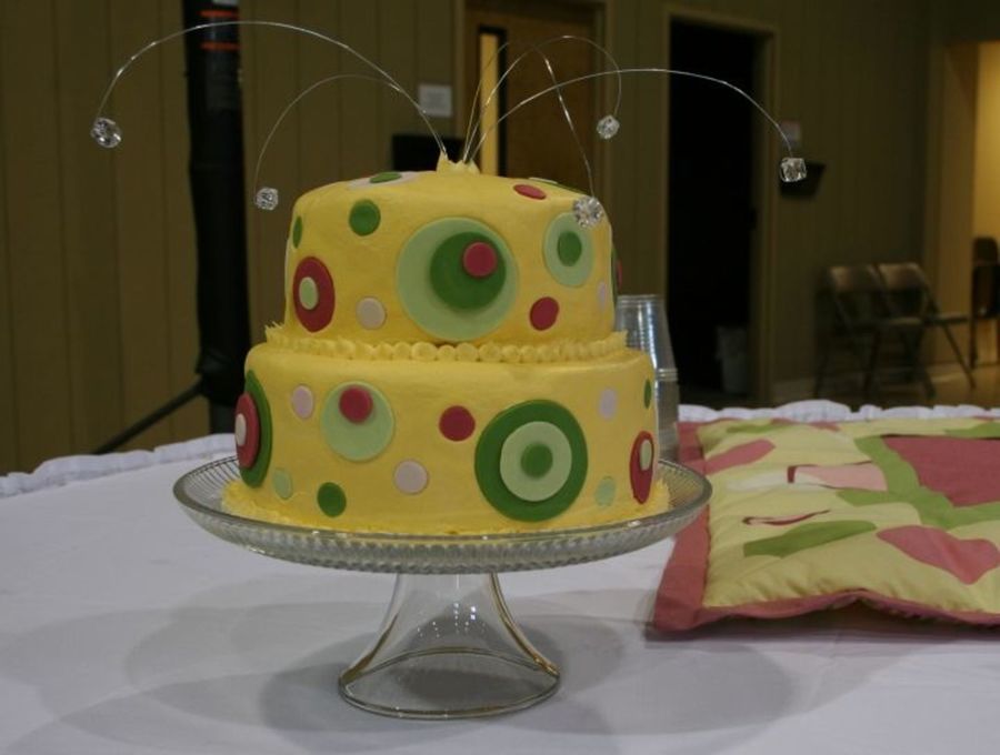 Baby shower cake based off the bedding behind the cake. Didn't get to see the bedding until the shower, was just given a picture. French vanilla cake with Wilton RMF and fondant circles. I made sure I used a straw to insert the wire in to since it wasn't food grade, per many discussions on this site!