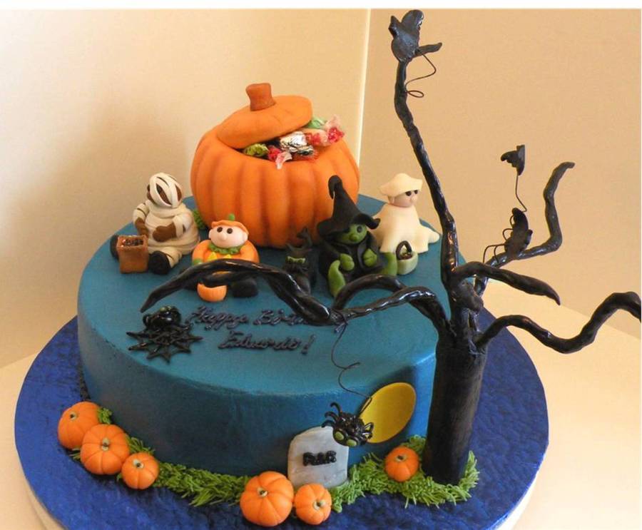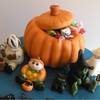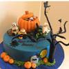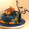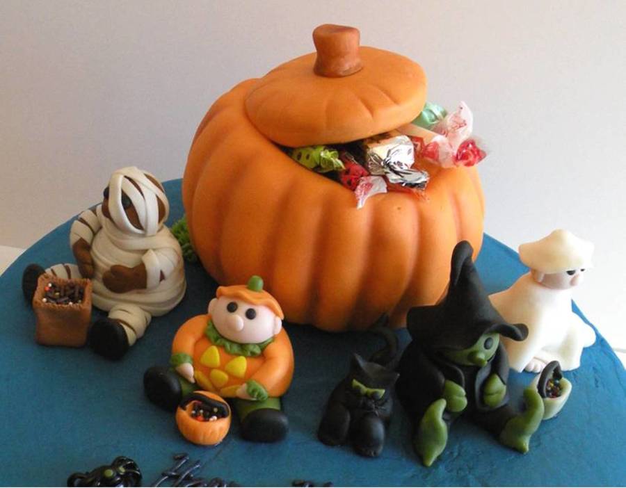 Birthday cake for a friend's son. Chocolate with chocolate filling. The pumkin is gingerbread cake covered in fondant (the lid is a cookie :) The kids are hand-made with 50/50.