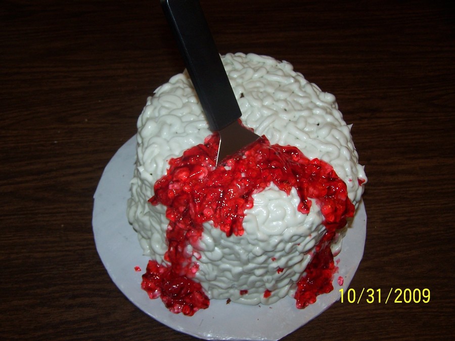 Red velvet with cream cheese brain matter. I tried to carve it somewhat, but I didn't want to go too skinny on the bottom like the real thing. It's for a friend's party. TFL