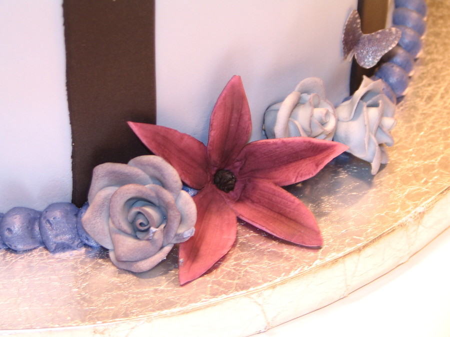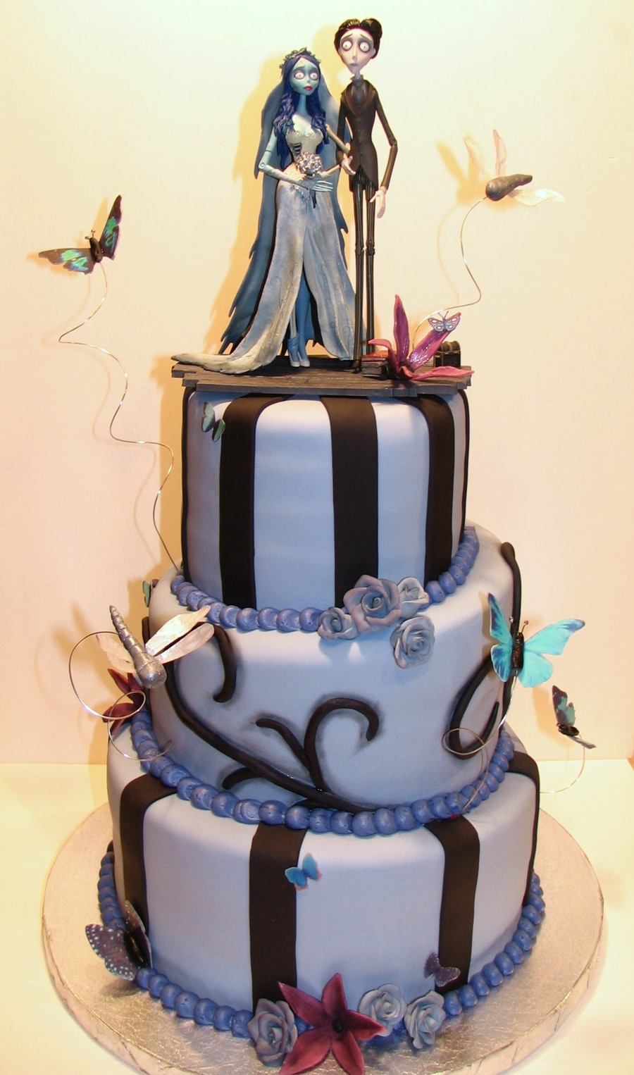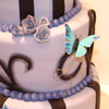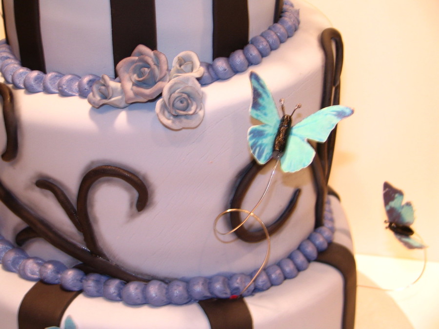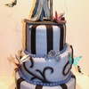 This is a copy of Pink Cake Box's corpse bride cake, and it was my first topsy turvy cake. The bride and groom topper was provided by the bride. The butterflies and dragonflies are edible rice paper. I used grey petal dust behind the swirls on the middle tier. Bottom tier was white cake with mocha filling, middle was chocolate fudge with Bavarian cream filling, and the top was chocolate fudge with raspberry.
