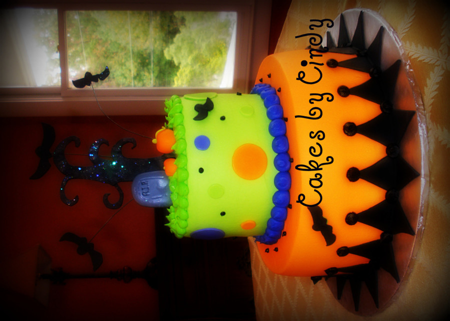 My first Halloween Cake! Red velvet cake with cream cheese filling, iced in Buttercream and Fondant accents.