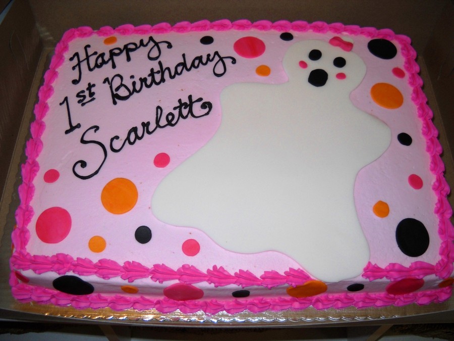 1/2 sheet marble cake with light pink buttercream, white fondant girl ghost, and orange/black/hot pink fondant dots.