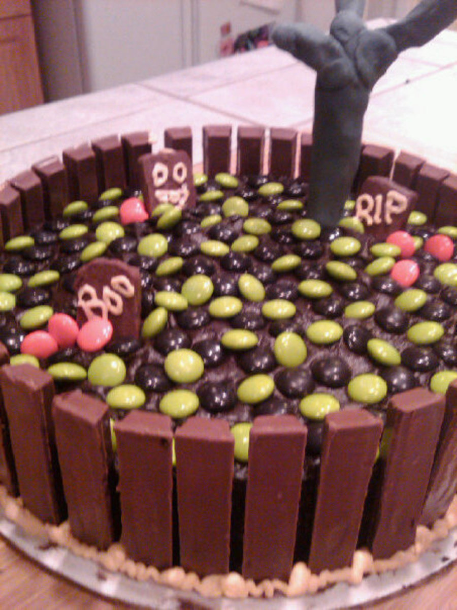 Cake was basic white, colored green with food coloring and strawberry filling. Frosting is chocolate. All decorations are candy. Kik-kat fence, M&M yard, snickers are the grave stones. Fondant tree and branches supported by popcicle sticks