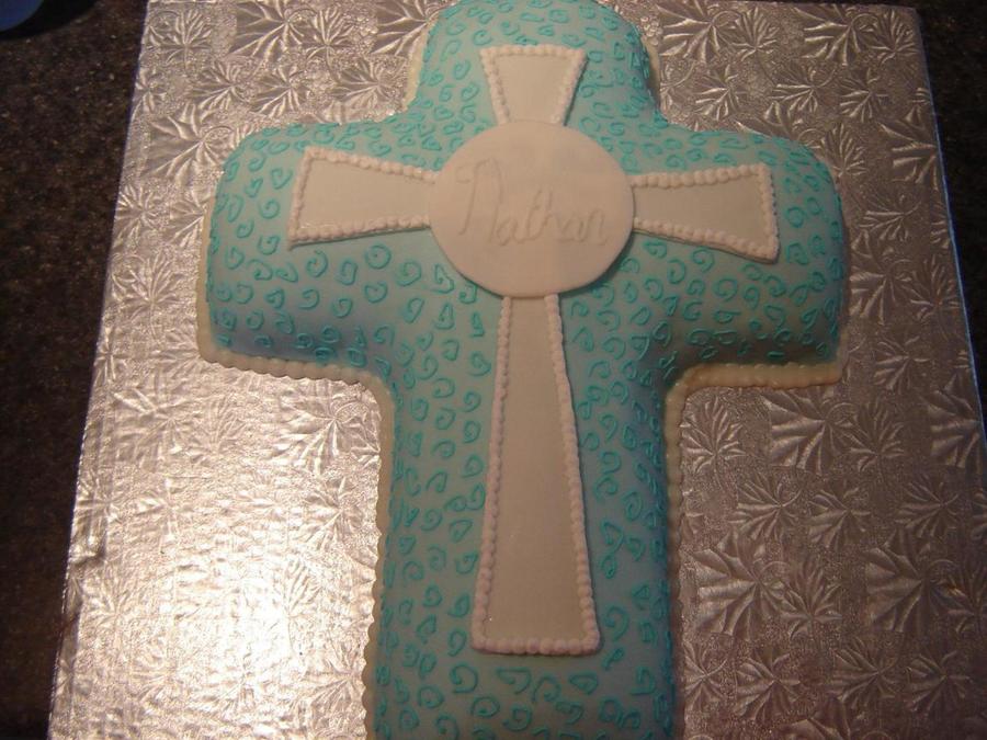 Made two cross cakes for a twins baptism. The mom picked the design from the Wilton website. The original design by Wilton is in blue.