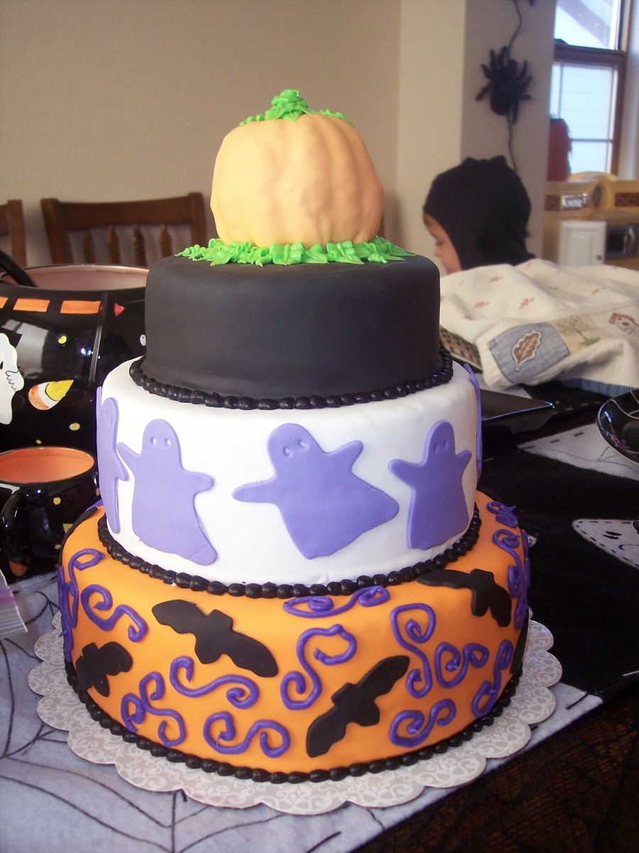 All fondate. Pumpkin on top was made with wilton pumpkin pan. I was trying to make the halloween cake in the wilton year book, but everything kept breaking. So this is what I came up with instead.