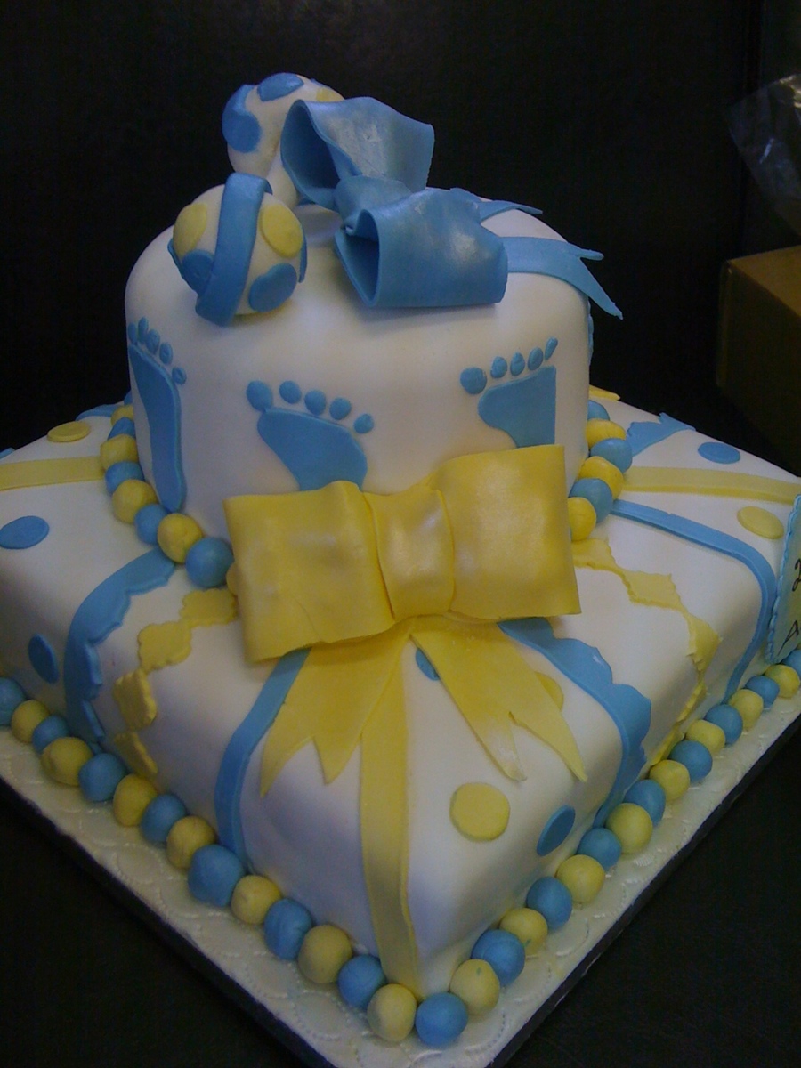 Rattle and Bows Cake. Bottom tier is Genoese sponge and top tier is a dummy cake.