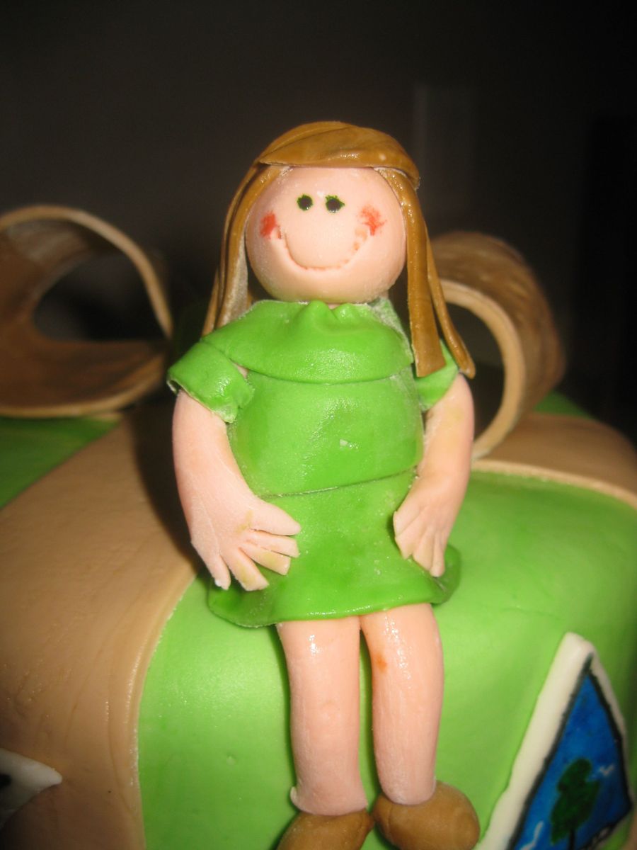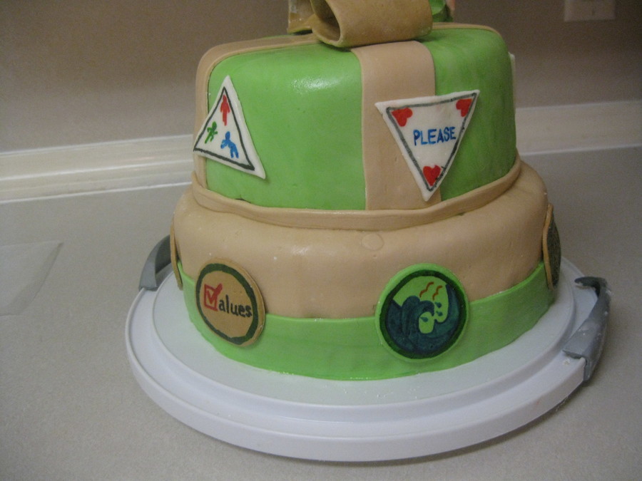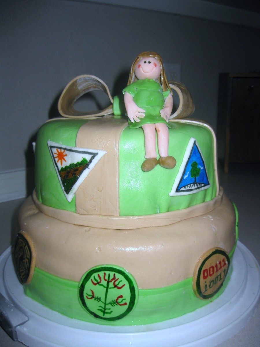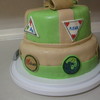 Our service unit had a birthday party for the founder of Girl Scouting and Girl Guiding~ Juliette Gordon Low. This is 2 layers of 10in and 2 layers of 8 in in french vanilla. Fondant over buttercream with fondant "badges" and gumpaste/fondant figure of Juliette sitting smartly on top!