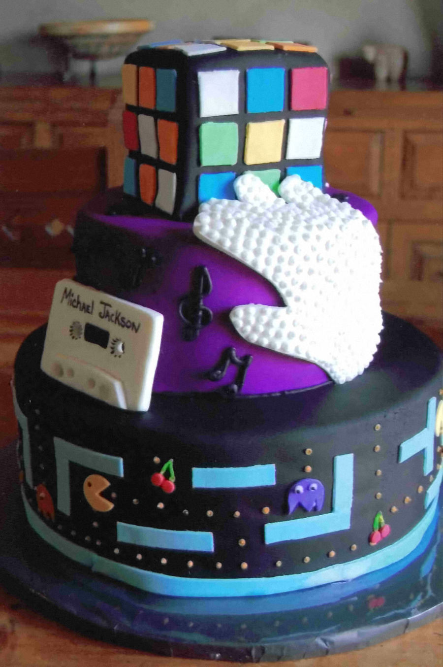 An 80's themed cake! Each layer represents a different aspect of the 1980's.