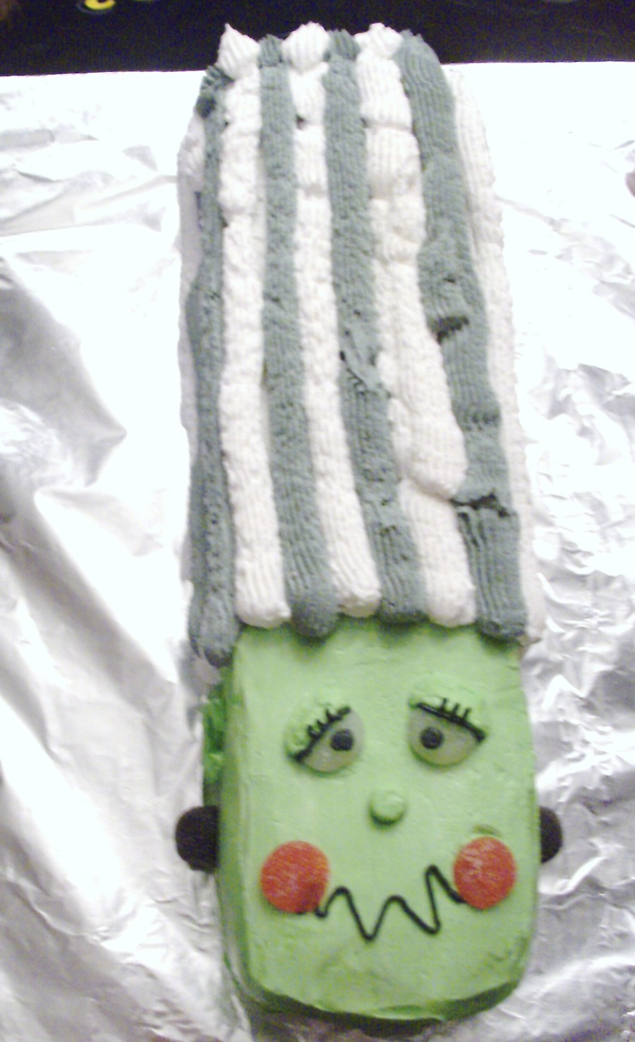 This is the cake I did for our Halloween Party. Vanilla cake with strawberry filling iced in BC. Eyes, cheeks and bolts are large gumdrops.