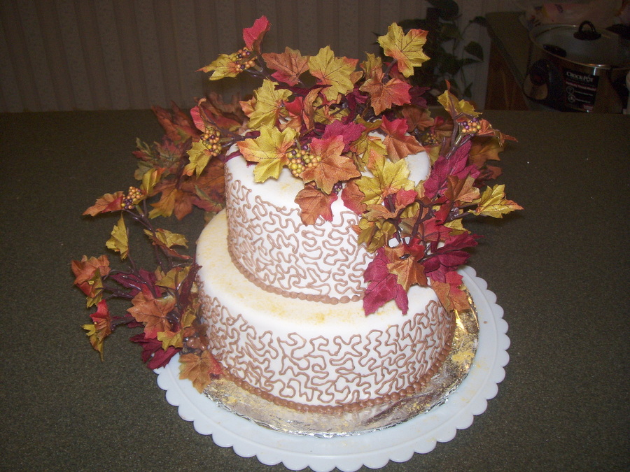 This was a cake ordered for a retirement party. The flowers are silk - chosen by the customer. Chocolate butter cake with raspberry filling, covered in ivory fondant. Piped with cholocate royal icing.