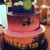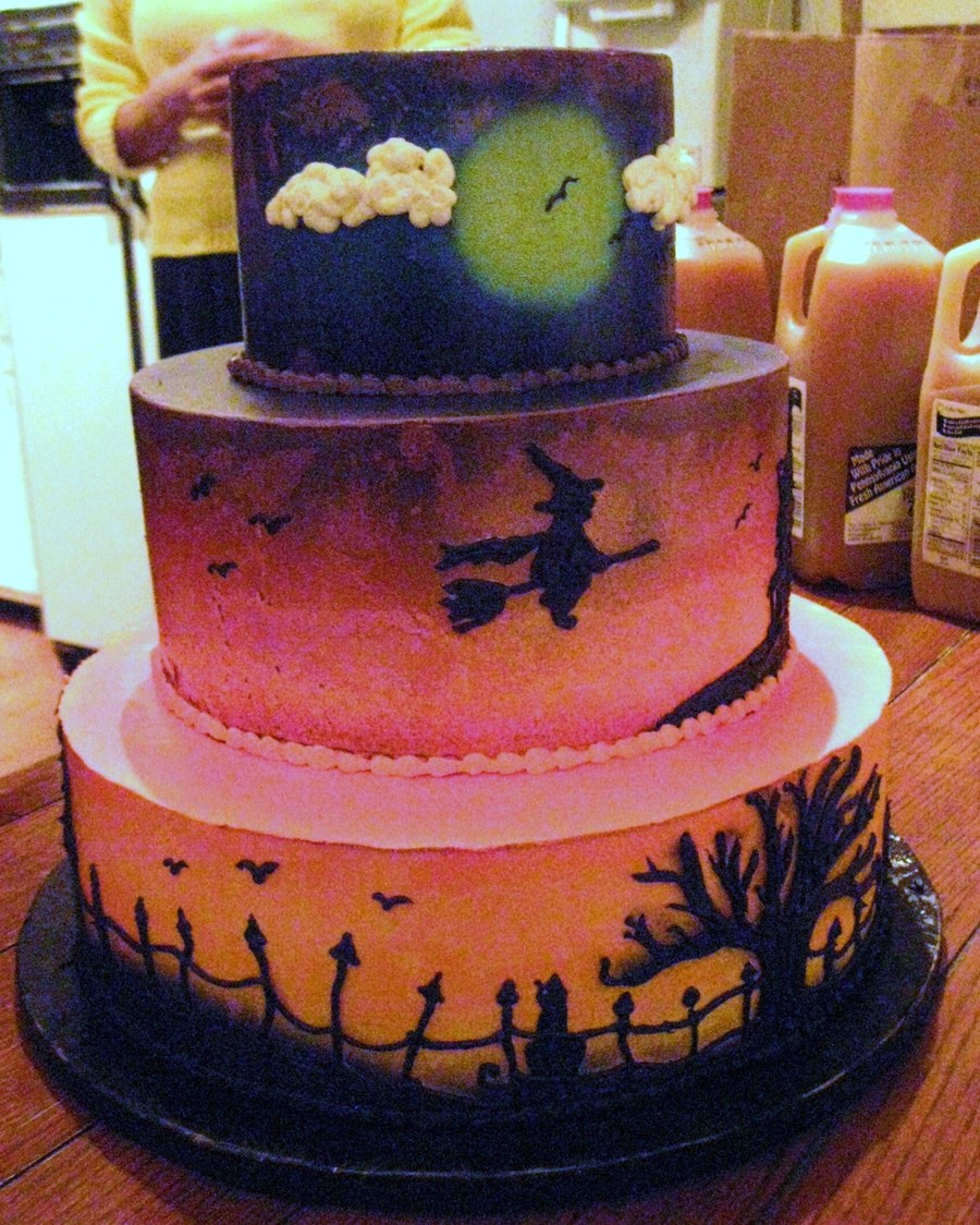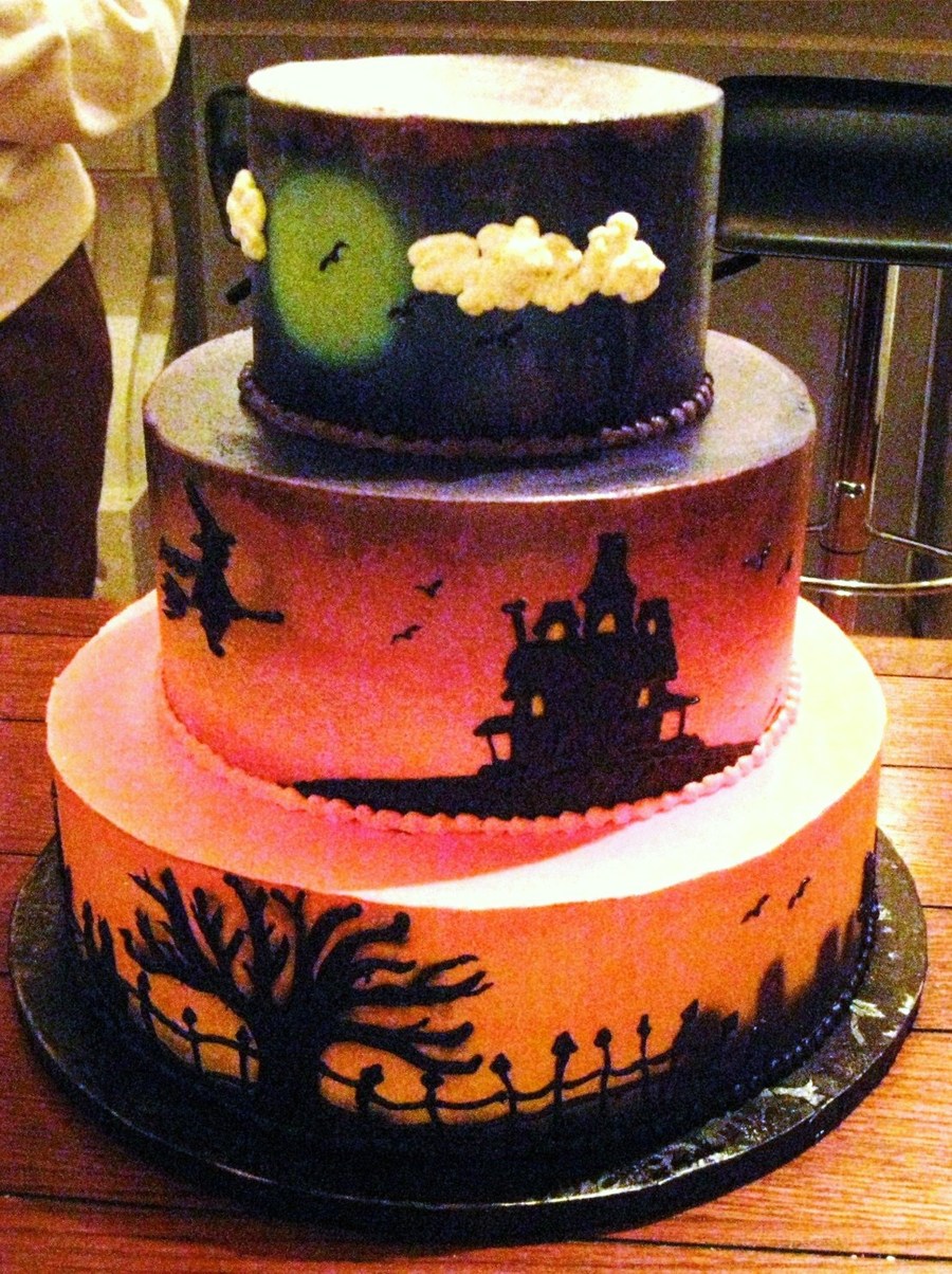 Airbrushed over Italian buttercream, and hand piped with black buttercream for added depth. Sorry for the poor quality photo. I lost my camera and these are the only ones that Ive gotten from the people that had cameras. Ill up date with better ones when I get them. The pumpkin carriage topper was not even in place here.